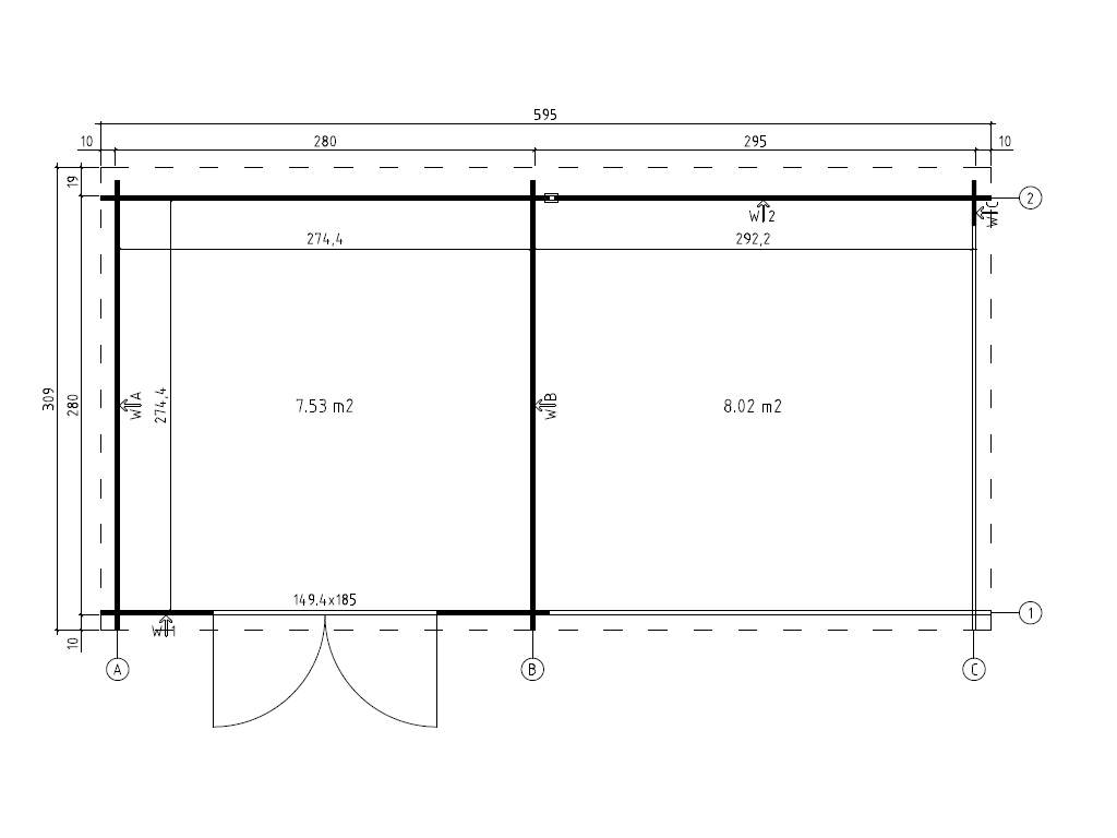 B x T x H: 595 x 309 x 211 cm, Sockelmaß Haus B x T: 280 x 280 cm, inkl. 300 cm Anbau