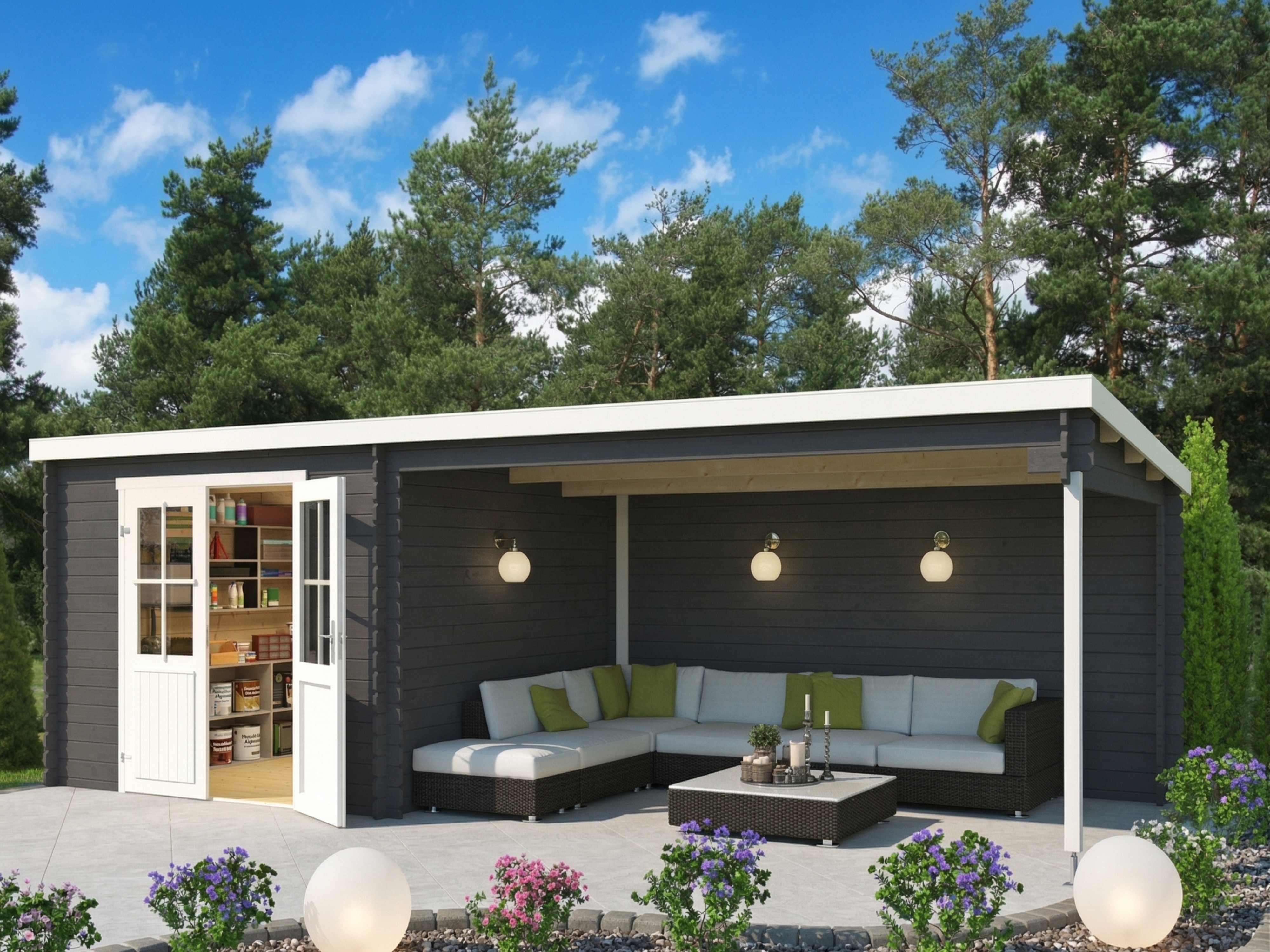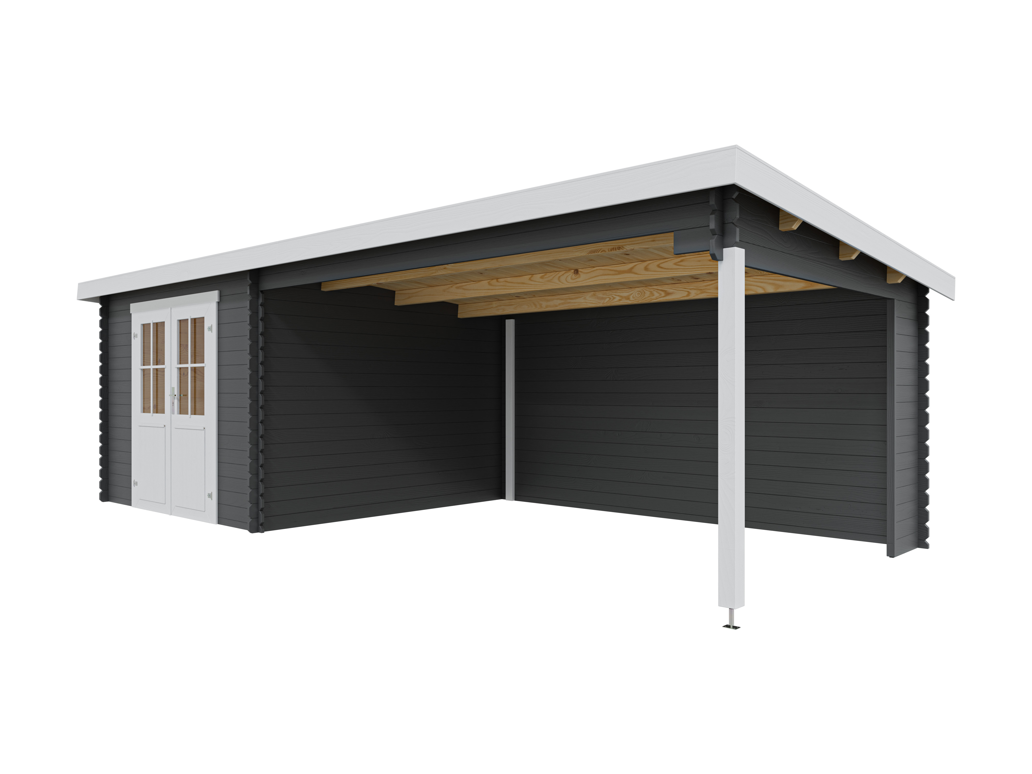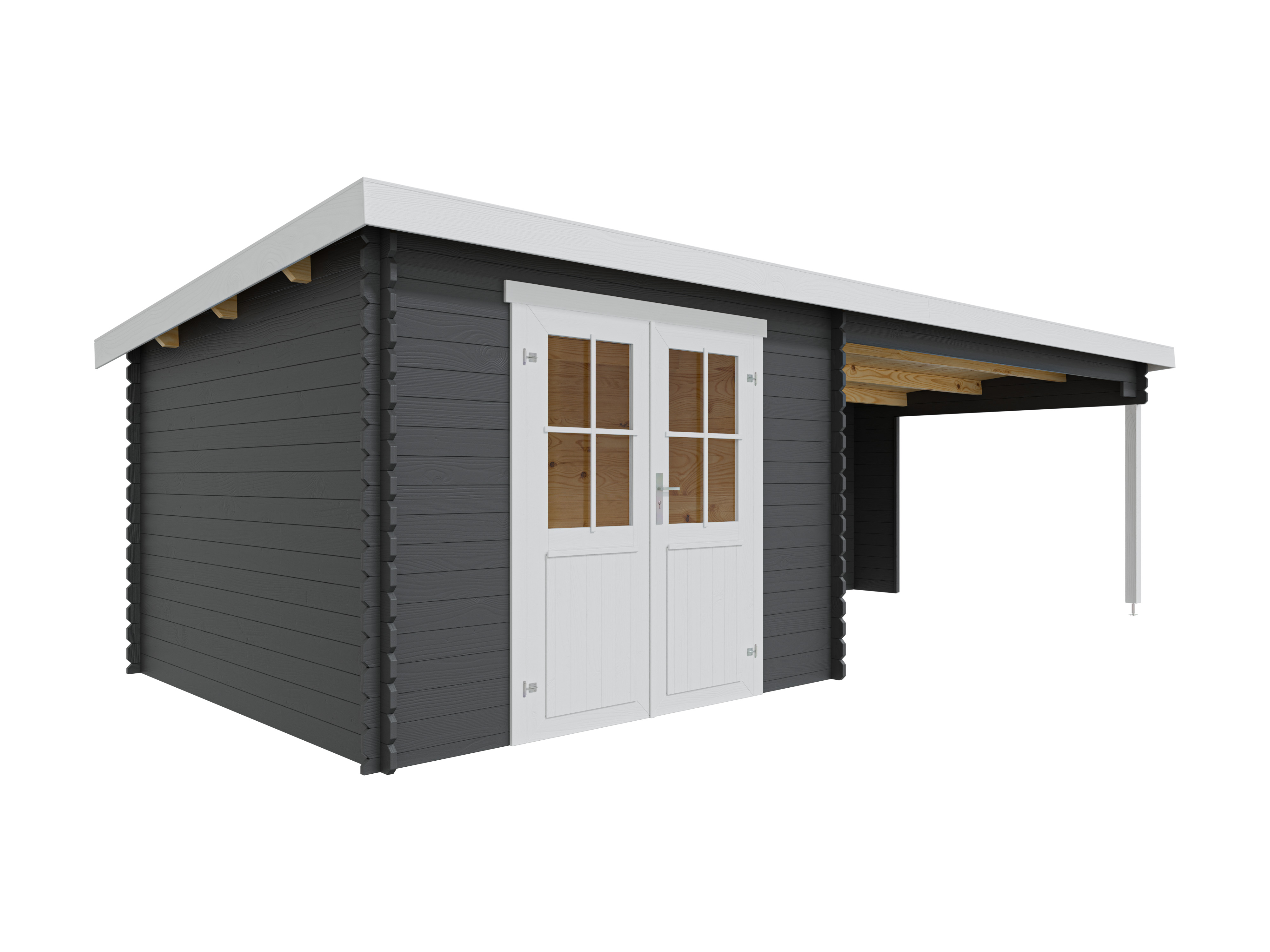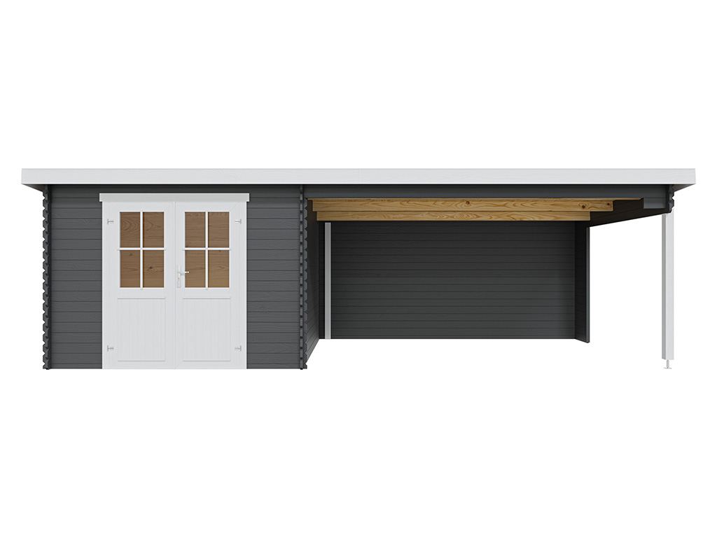 Gartenhaus Blockbohlenhaus St. Louis Exklusiv 28 mm carbon grau mit 4 m Anbau