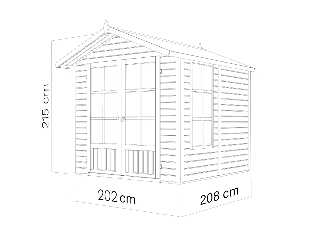 Die Grundfläche des Gartenhauses beträgt 4,2 m². Das Sockelmaß (Haus ohne Anbau) liegt bei 202 x 208 cm (B x T). Das Sockelmaß liegt bei 202 x 208 cm (B x T). Eine optimale Raumnutzung wird dank einer Firsthöhe von 215 cm gewährt.