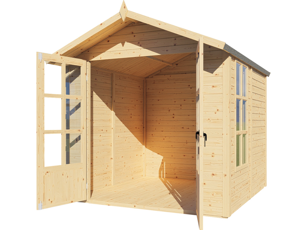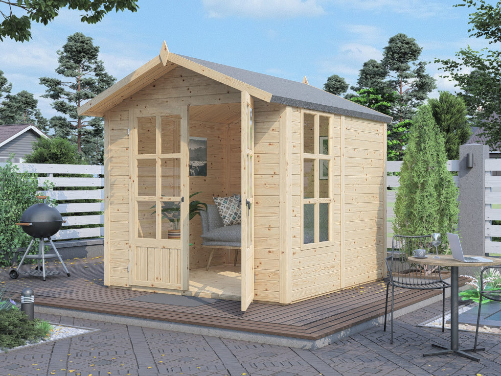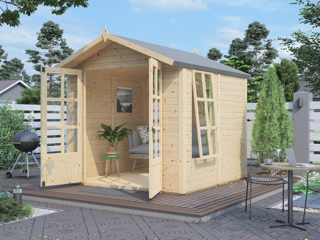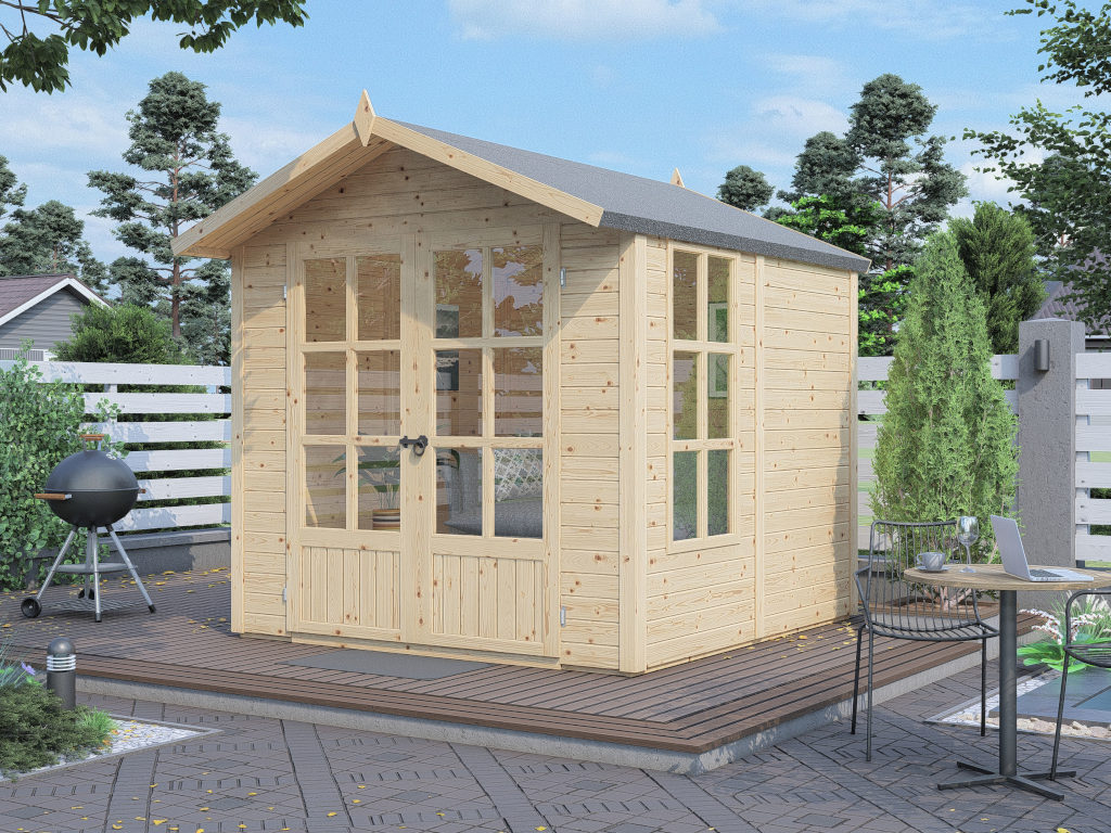 Das naturbelassene Holz sorgt für ein natürliches und zeitloses Aussehen. Außerdem ermöglicht dir das unbehandelte Holz, das Äußere des Gartenhauses ganz nach deinen eigenen Wünschen zu gestalten.