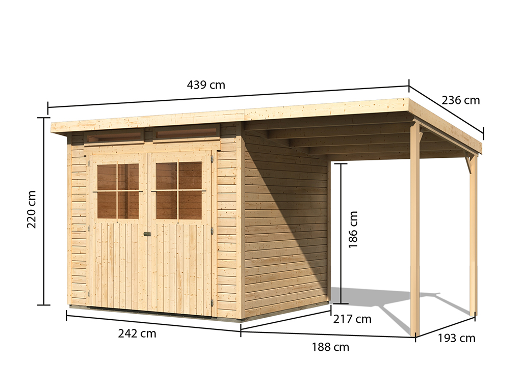 B x T x H: 439 x 236 x 220 cm, Sockelmaß Haus: B x T: 238 x 213 cm, inkl. 190 cm Anbaudach