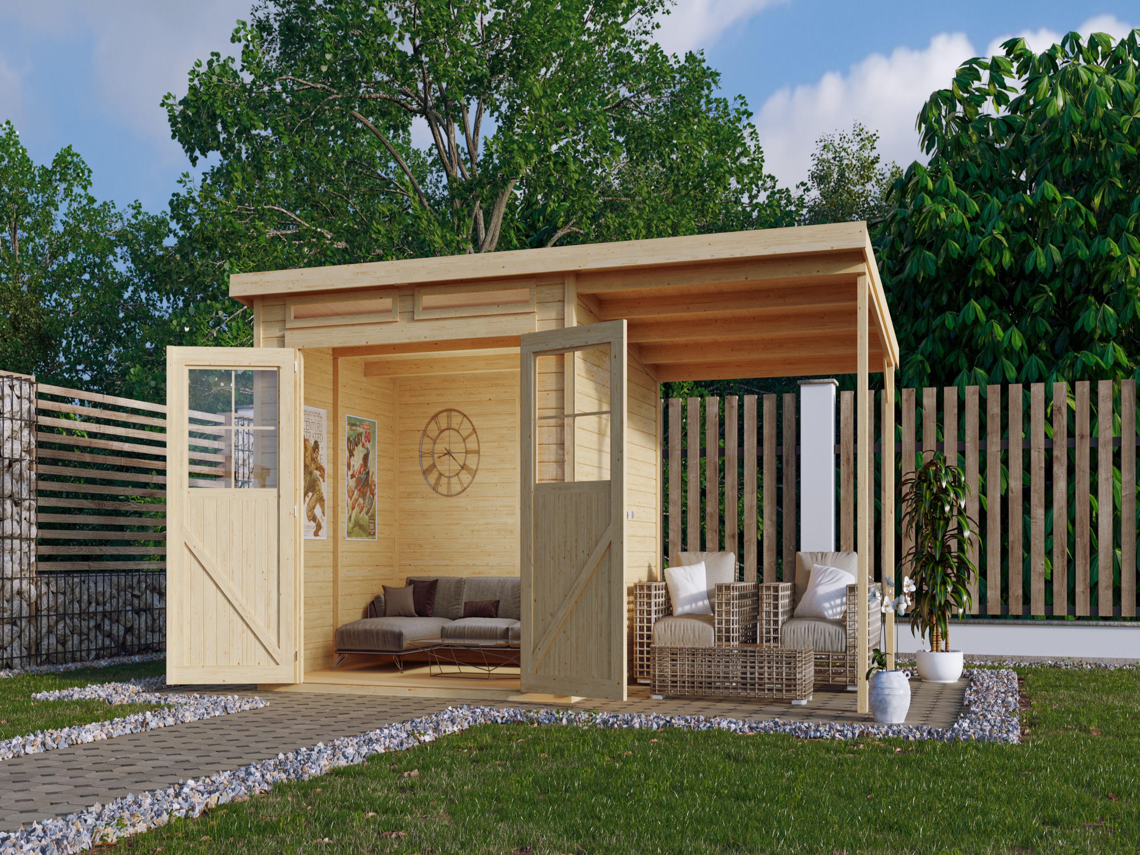 Gartenhaus Homeoffice Arvo 28 mm naturbelassen mit 250 cm Anbau Gartenhaus Homeoffice Arvo 28 mm naturbelassen...