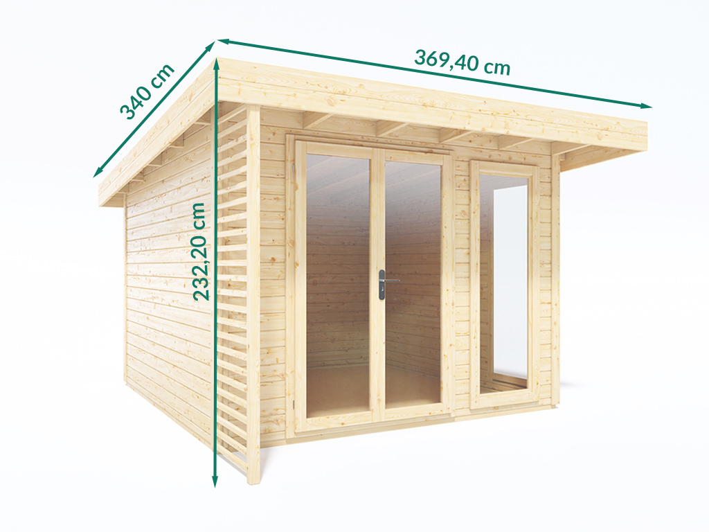 B x T x H: 340 x 369,4 x 232,2 cm, Sockelmaß Haus: B x T: 300 x 300 cm, inkl. Ganzglastür & zwei Fenster