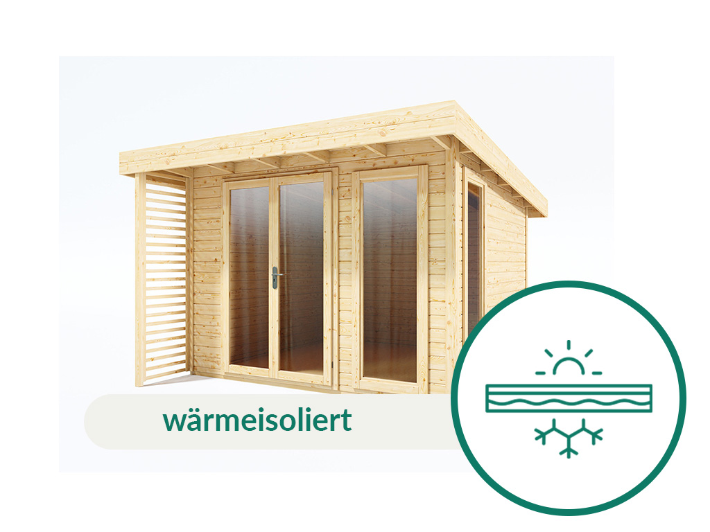 Mit einer Wandstärke von 28 mm ist das robuste Gartenhaus der perfekte Aufenthaltsort im Sommer. Aufgrund wärmedämmender Eigenschaften des hochwertigen Holzes ist es im Inneren des Gartenhauses während der prallen Sommerhitze 3–5 Grad kühler und in den kälteren Abendstunden 3–5 Grad wärmer als draußen. So hast du im heißen Sommer immer ein schattiges Plätzchen. Dank der soliden Wandstärke verwittert das Holz nicht so schnell und bleibt langlebig sowie stabil.