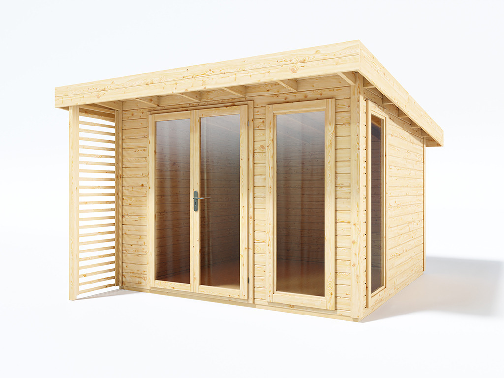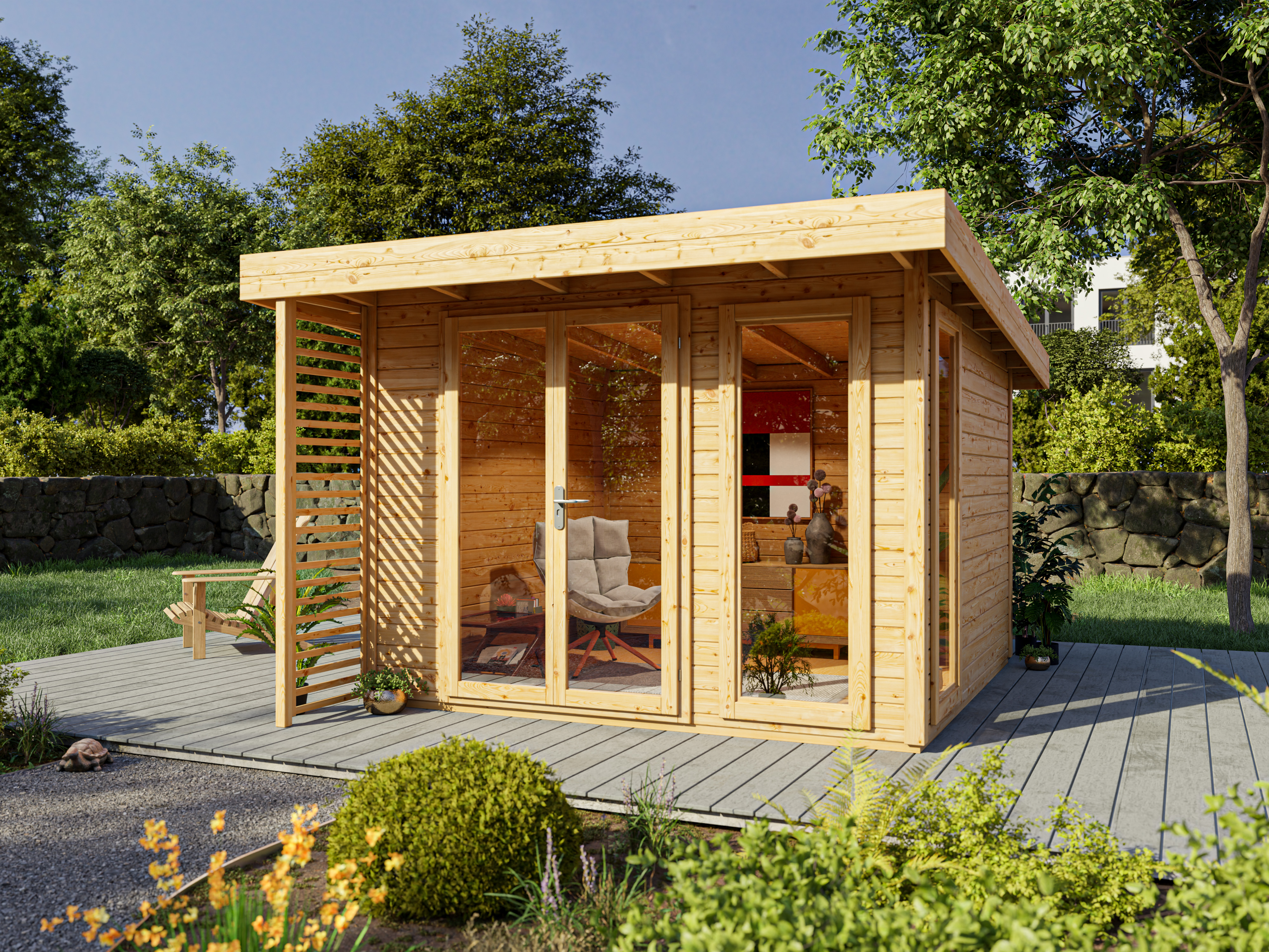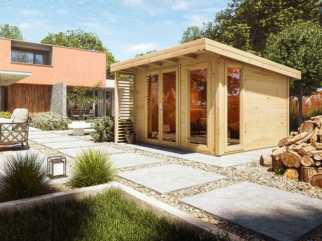 Gestaltungsbeispiel Gartenhaus Homeoffice Ivar 28 mm naturbelassen