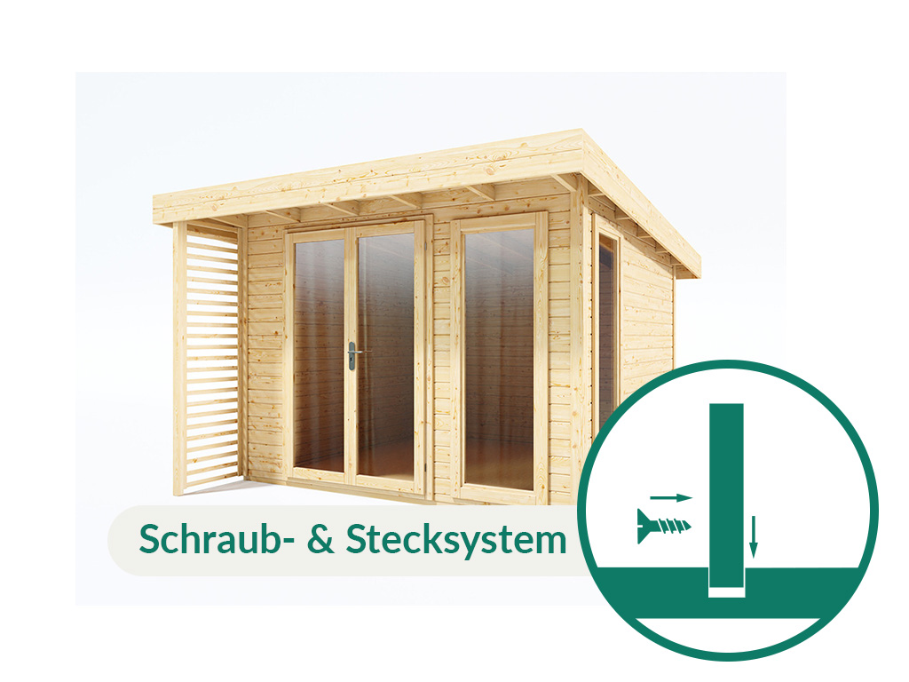 Ein Gartenhaus in Systembauweise ist eine günstige Alternative zur Blockbohlenbauweise. Auch bei dieser Bauweise werden bereits vorgefertigte Profilhölzer durch eine Nut-und-Feder-Verbindung aufeinandergesteckt. Im Gegensatz zur Blockbohlenbauweise besitzt die Systembauweise jedoch keine Einkerbungen an der Kopfseite des Gartenhauses. Die Bohlen werden stattdessen durch einen innenliegenden Holzrahmen zusammengehalten. Die Ecken werden mit hochkant angebrachten Zierleisten verdeckt. Dies macht den Auf- und Abbau besonders einfach und unkompliziert. Von Vorteil ist auch, dass Fenster und Türen nachträglich eingebaut werden können.