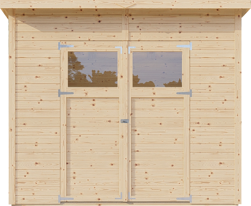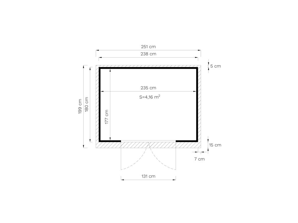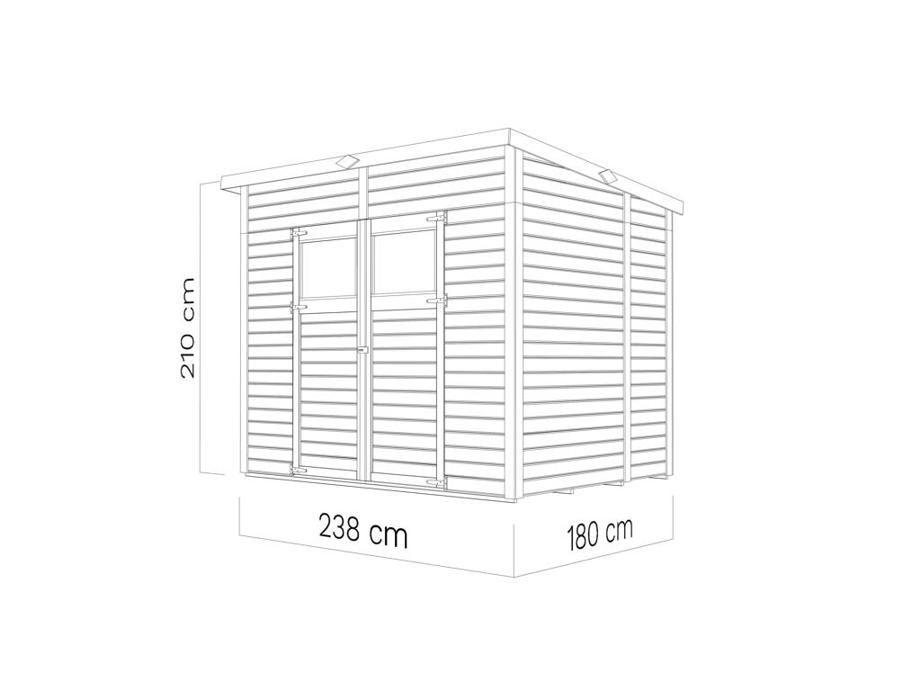 Die Grundfläche des Gartenhauses beträgt 4,27 m². Das Sockelmaß liegt bei 238 × 180 cm (B x T). Eine optimale Raumnutzung wird dank einer Firsthöhe von 210 cm gewährt.
