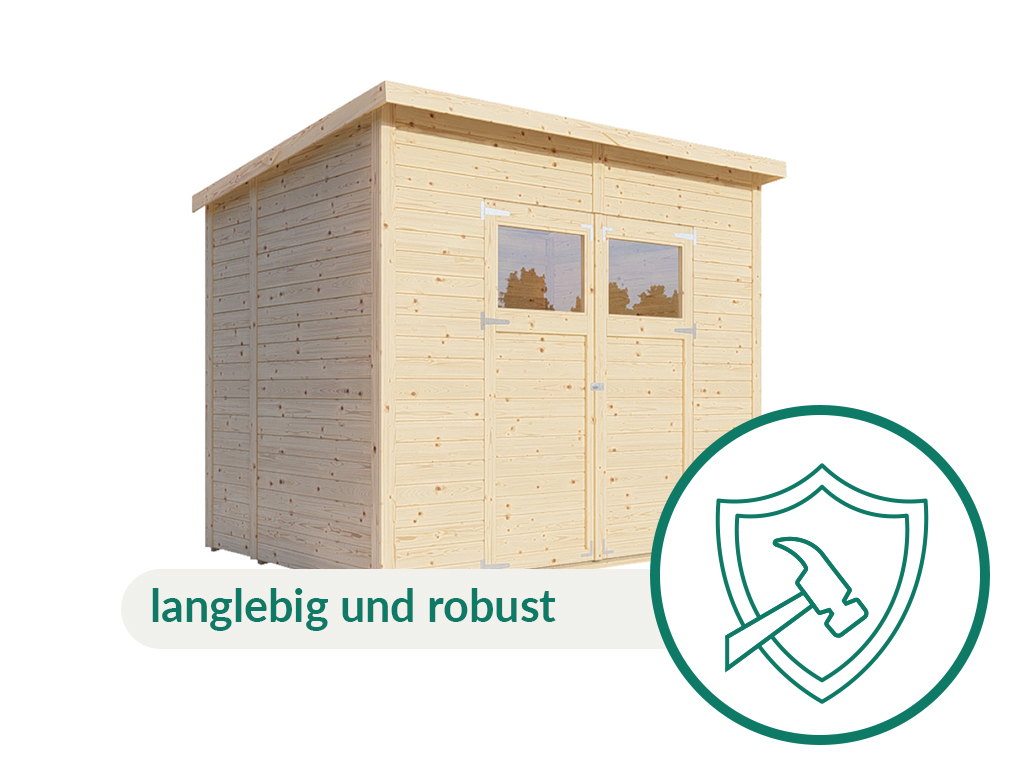 Ein modernes Pultdach verleiht deinem Gartenhaus eine stilvolle, elegante Optik. Durch nur eine geneigte Dachfläche ist die Nutzungsfläche im Inneren des Gartenhauses deutlich weniger eingeschränkt und der Verlust an Nutzraum gering. Zudem lässt die Neigungsseite des Pultdaches das Regenwasser gut abfließen und es ist die Montage von nur einer Regenrinne nötig.