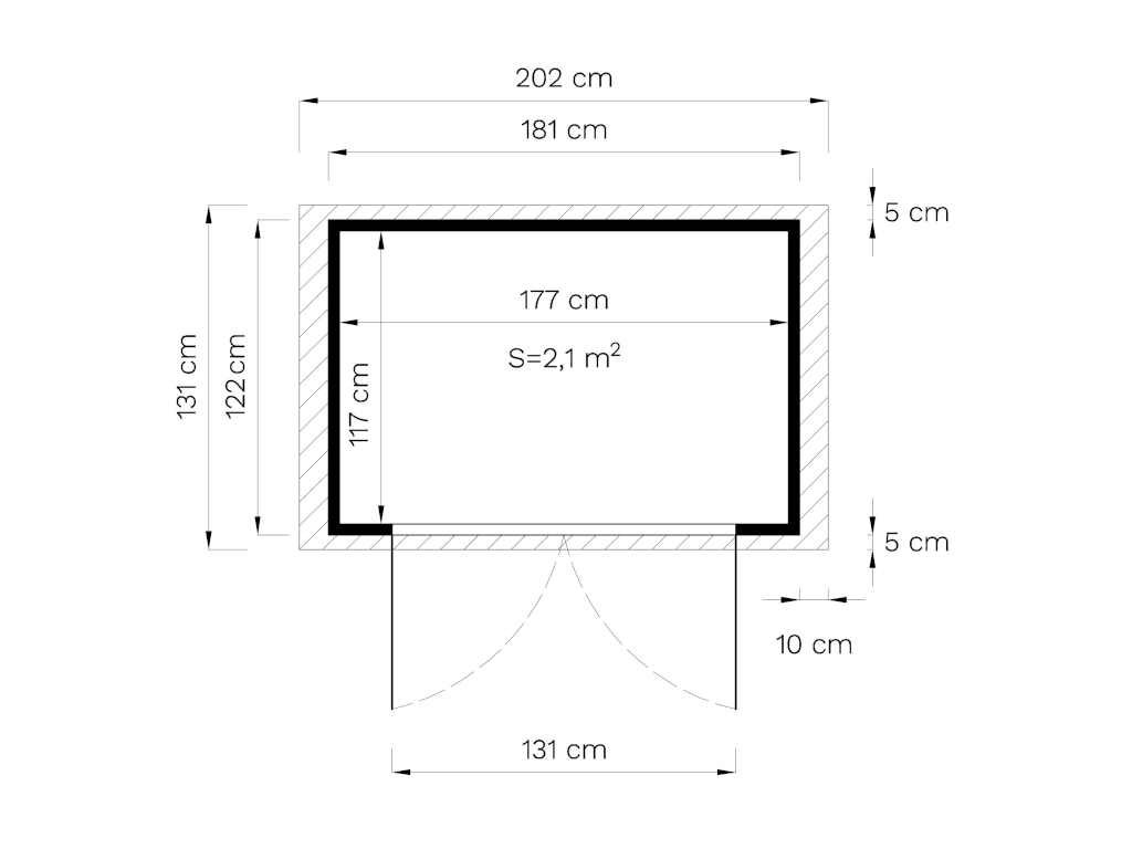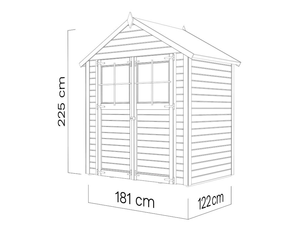 Die Grundfläche des Gartenhauses beträgt 2,21 m². Das Sockelmaß (Haus ohne Anbau) liegt bei 181 x 122 cm (B x T). Das Sockelmaß liegt bei 181 x 122 cm (B x T). Eine optimale Raumnutzung wird dank einer Firsthöhe von 225 cm gewährt.