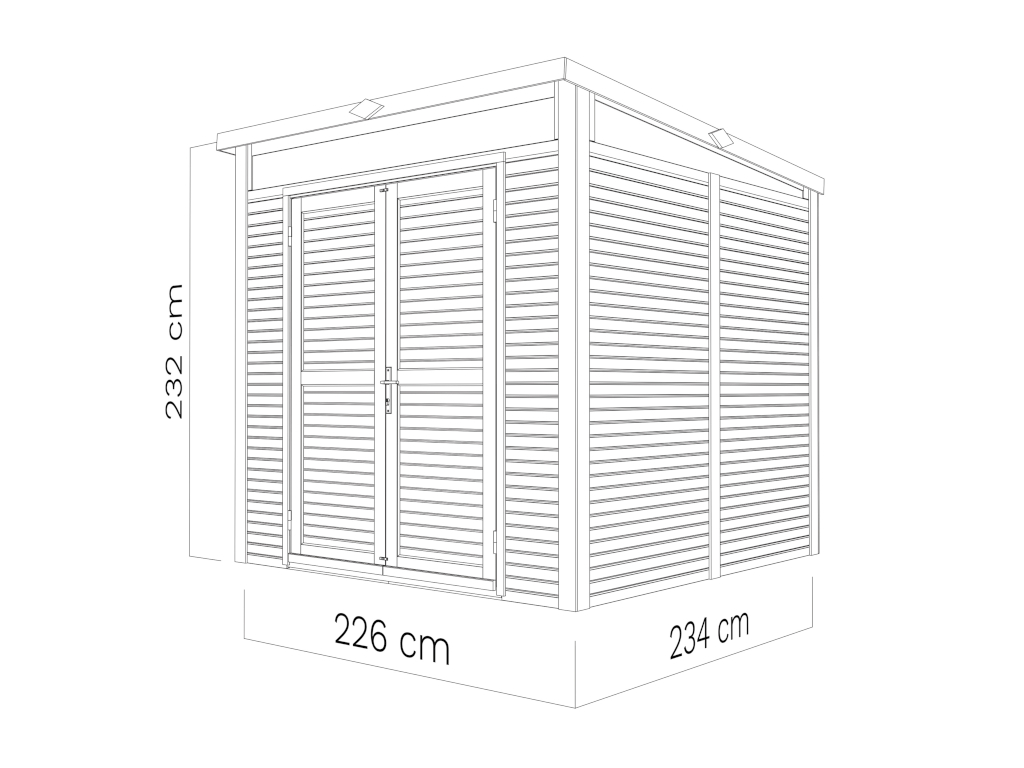 Die Grundfläche des Gartenhauses beträgt 5,11 m². Das Sockelmaß liegt bei 226 x 234 cm (B x T). Eine optimale Raumnutzung wird dank einer Firsthöhe von 232 cm gewährt.