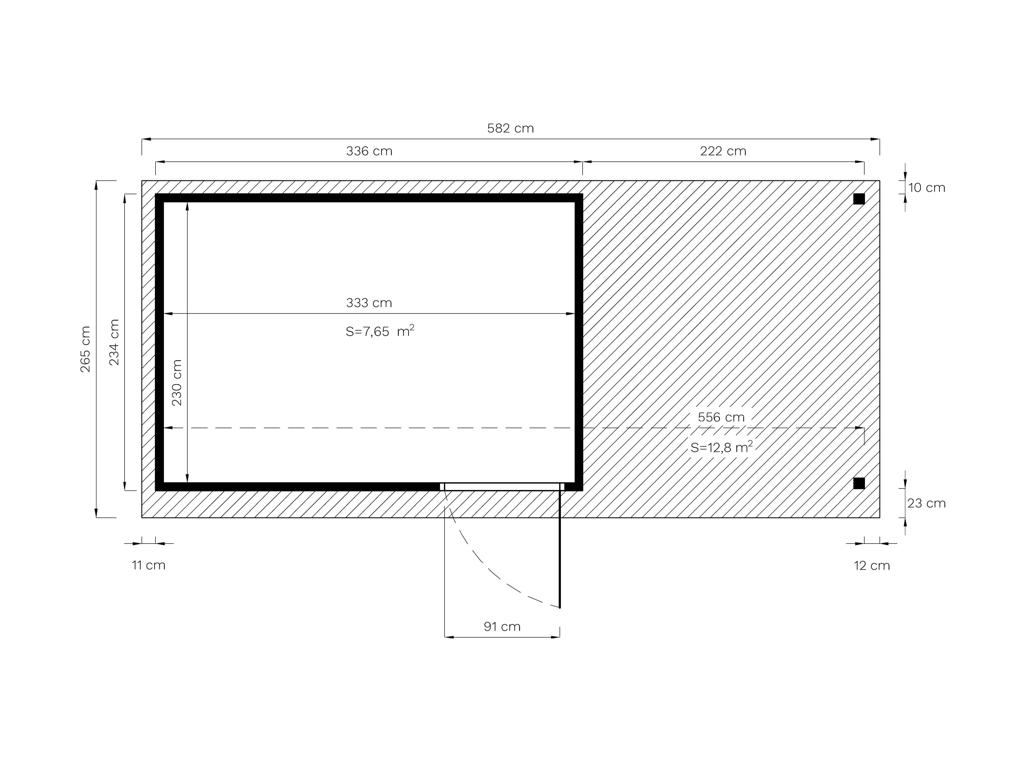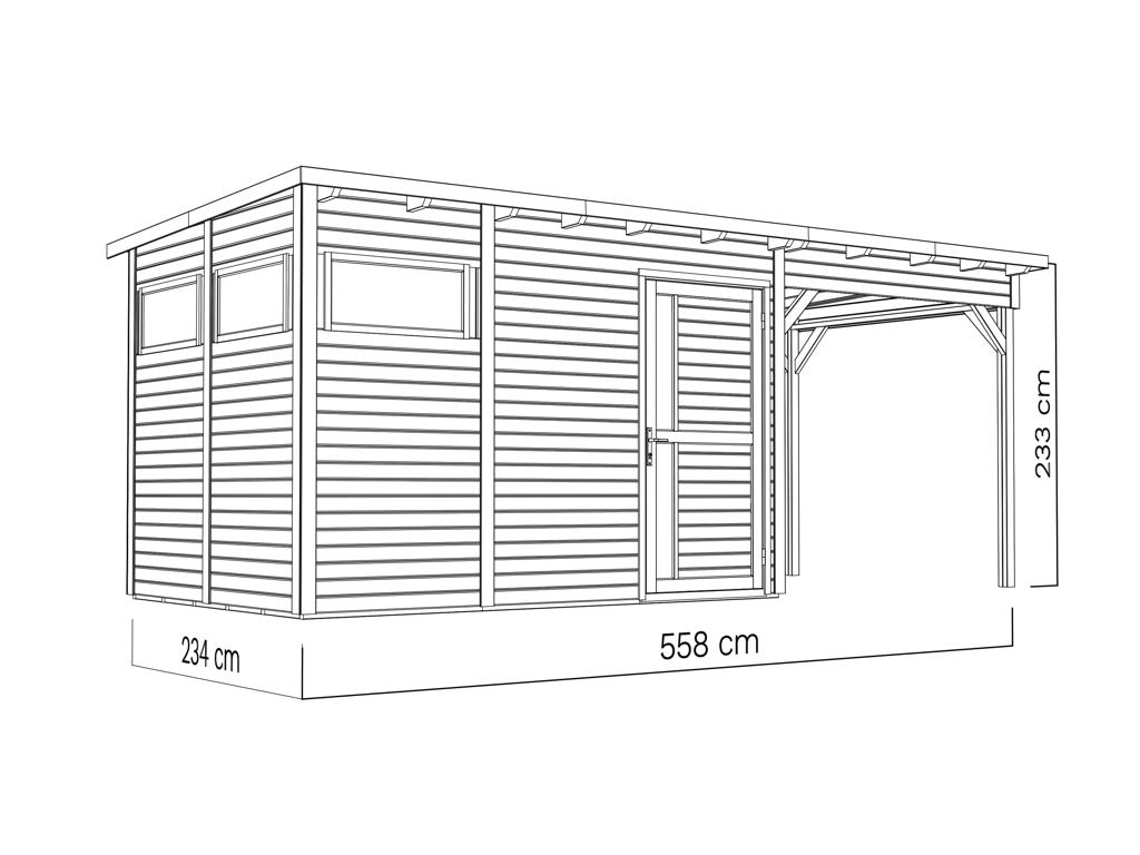B x T x H: 582 x 265 x 233 cm, Sockelmaß Haus: 336 x 234 cm, inkl. 2,2 m Anbau + Boden