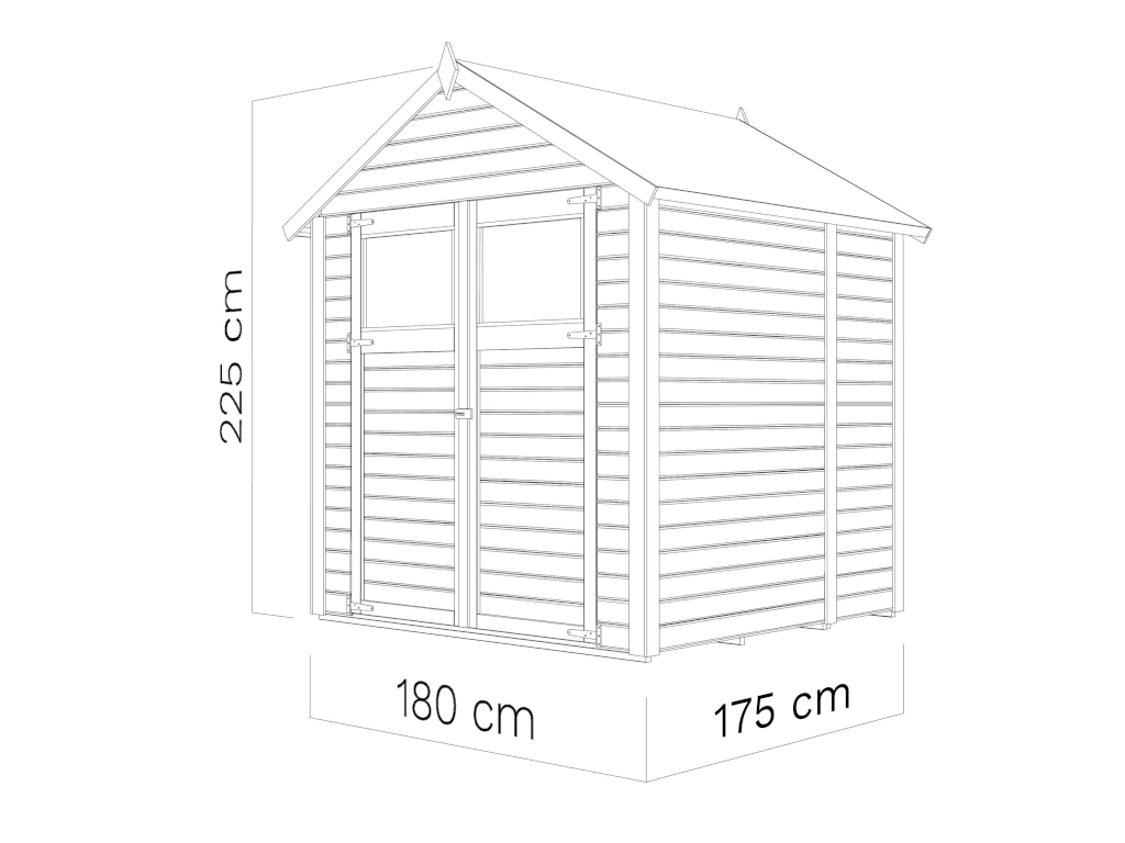 Die Grundfläche des Gartenhauses beträgt 3,03 m². Das Sockelmaß (Haus ohne Anbau) liegt bei 180 x 174 cm (B x T). Das Sockelmaß liegt bei 180 x 174 cm (B x T). Eine optimale Raumnutzung wird dank einer Firsthöhe von 225 cm gewährt.