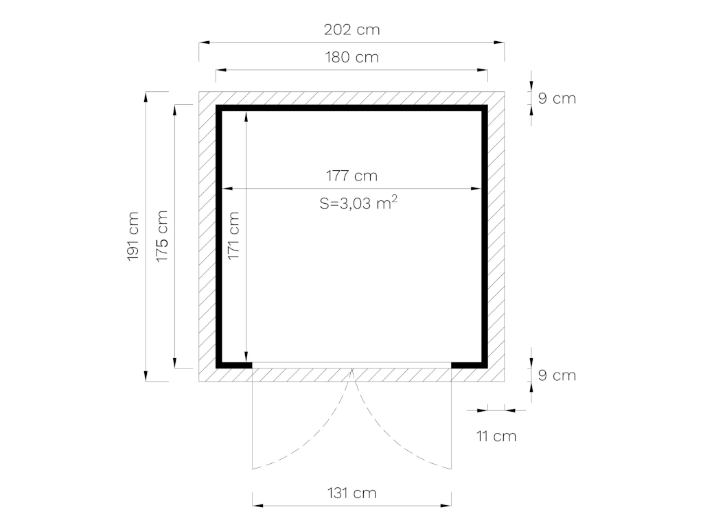 Die Grundfläche des Gartenhauses beträgt 3,03 m². Das Sockelmaß (Haus ohne Anbau) liegt bei 180 x 174 cm (B x T). Das Sockelmaß liegt bei 180 x 174 cm (B x T). Eine optimale Raumnutzung wird dank einer Firsthöhe von 225 cm gewährt.