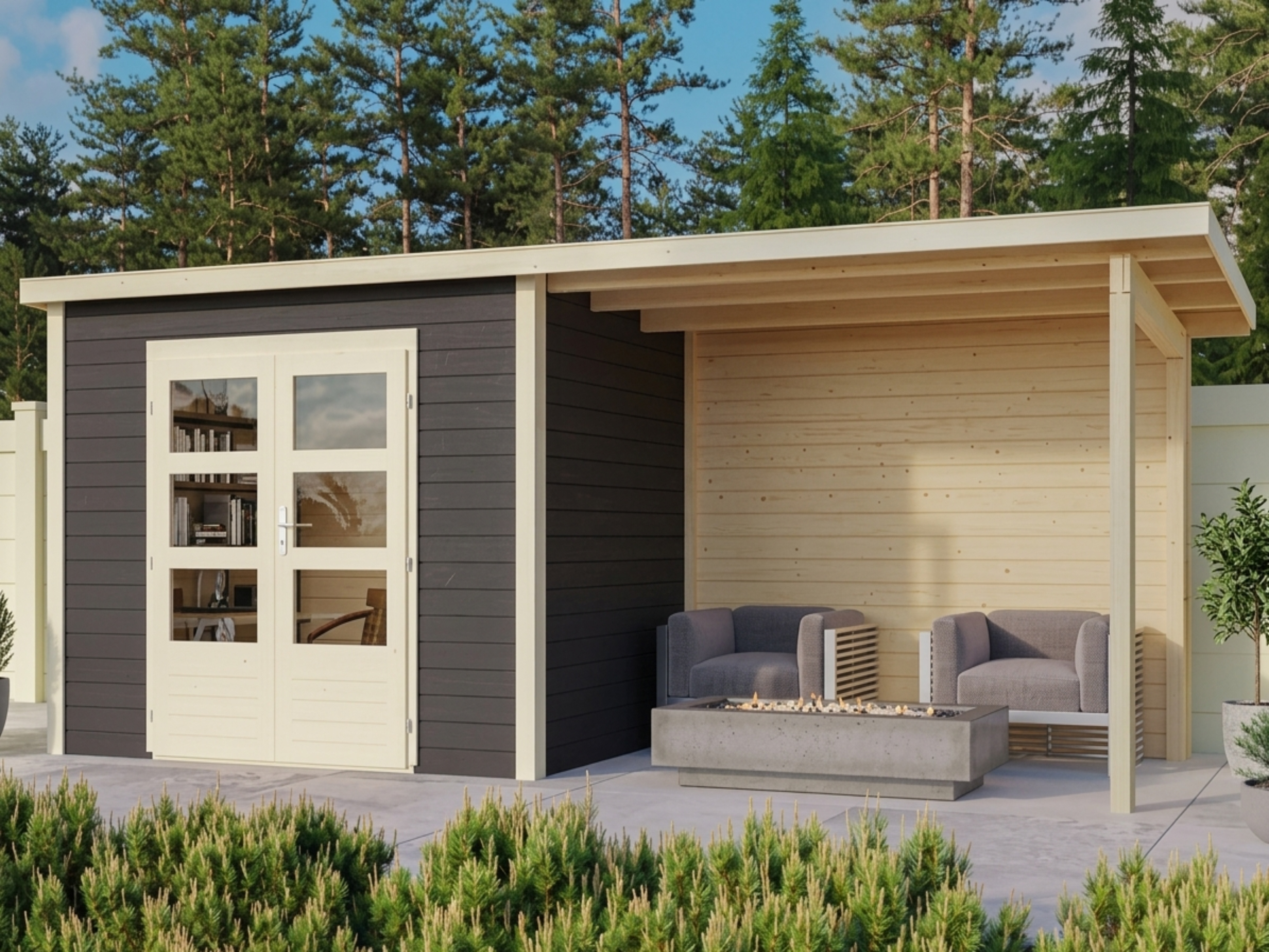 Gartenhaus Wacken 5 28 mm terragrau inkl. 3 m Anbau + Rückwand