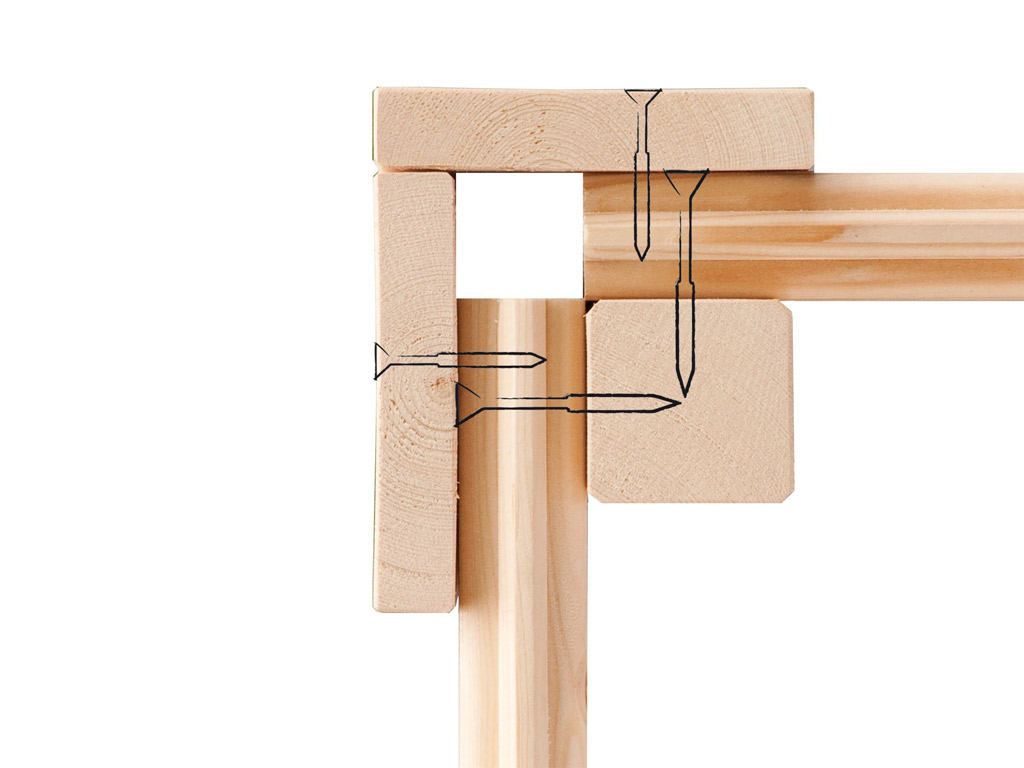 - Die Dachkonstruktion: 16 mm starkes Massivholzdach aus gehobelten Nut- und Federbrettern.