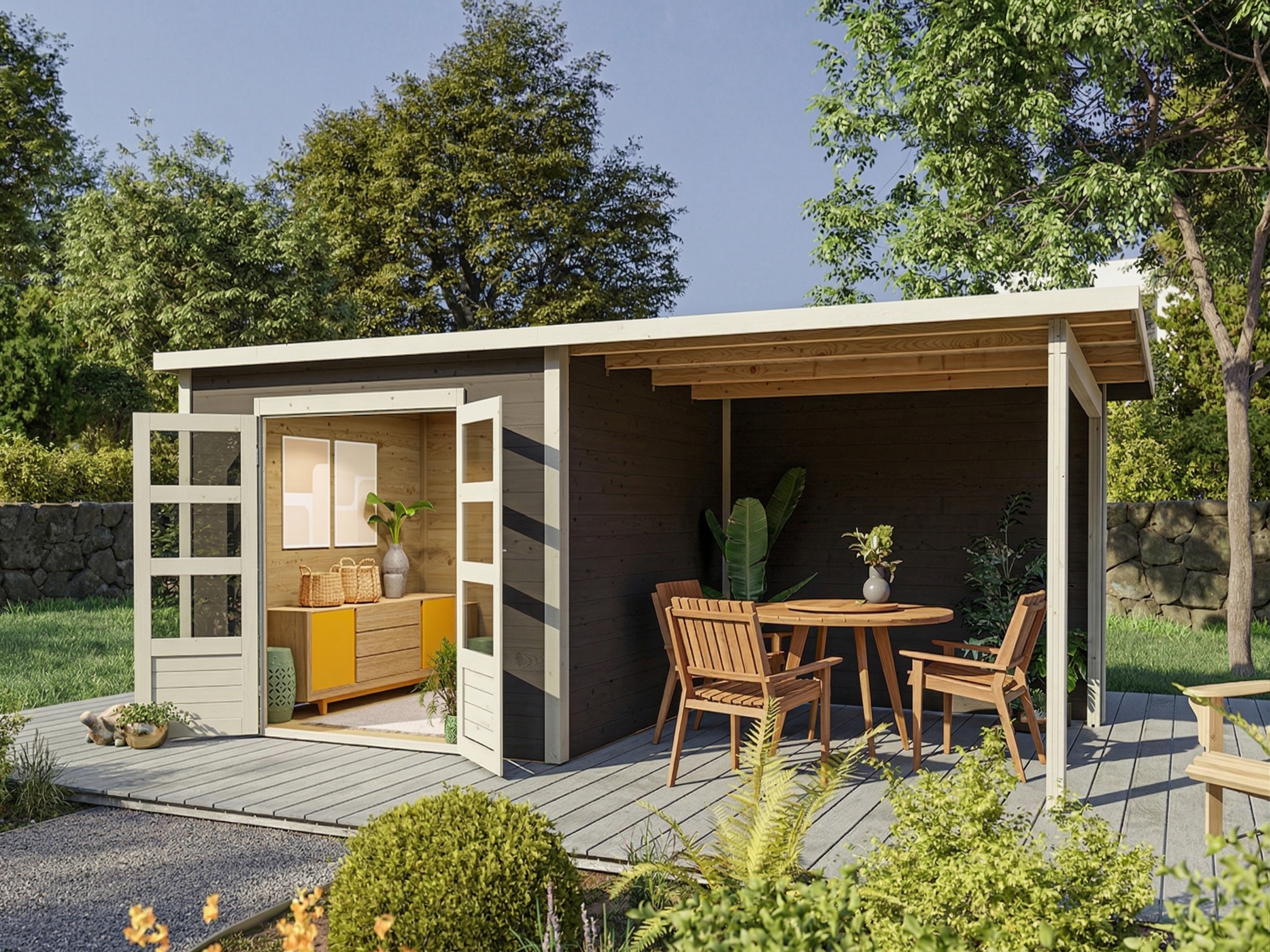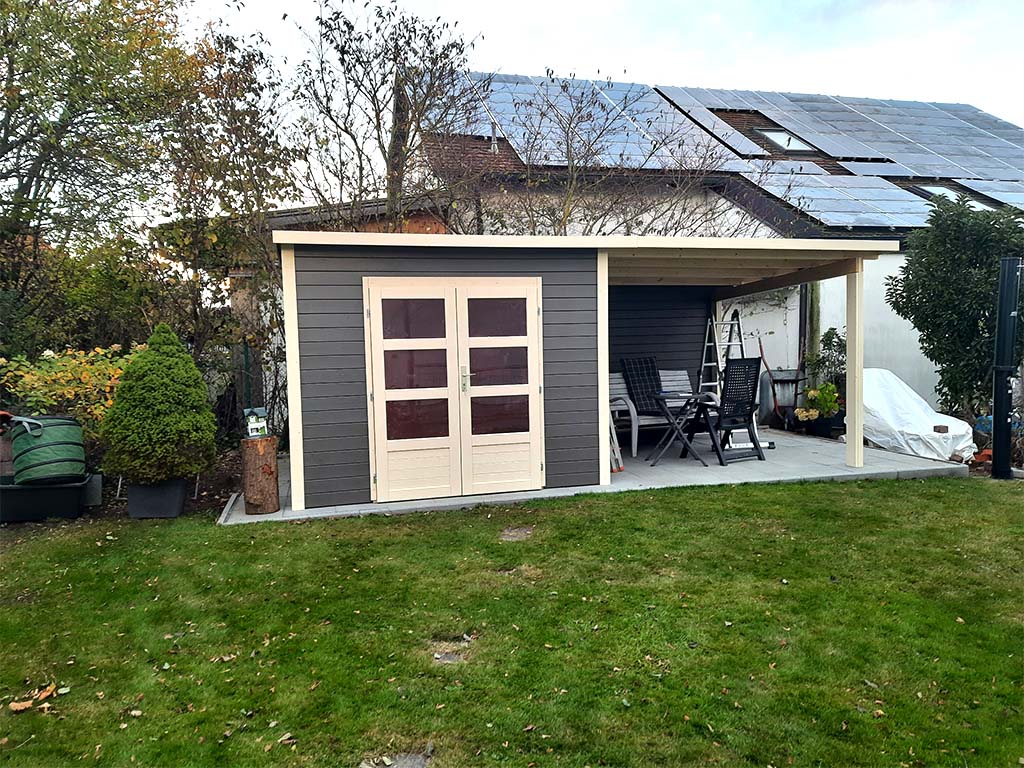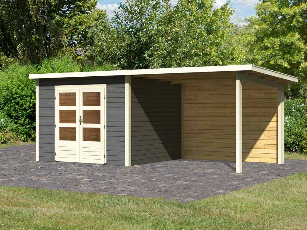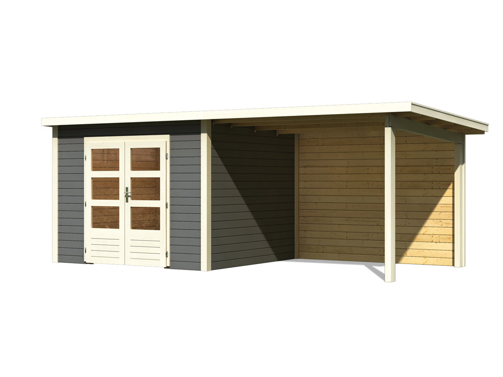 Gartenhaus Wacken 6 28 mm terragrau, inkl. 3 m Anbau + Rückwand
