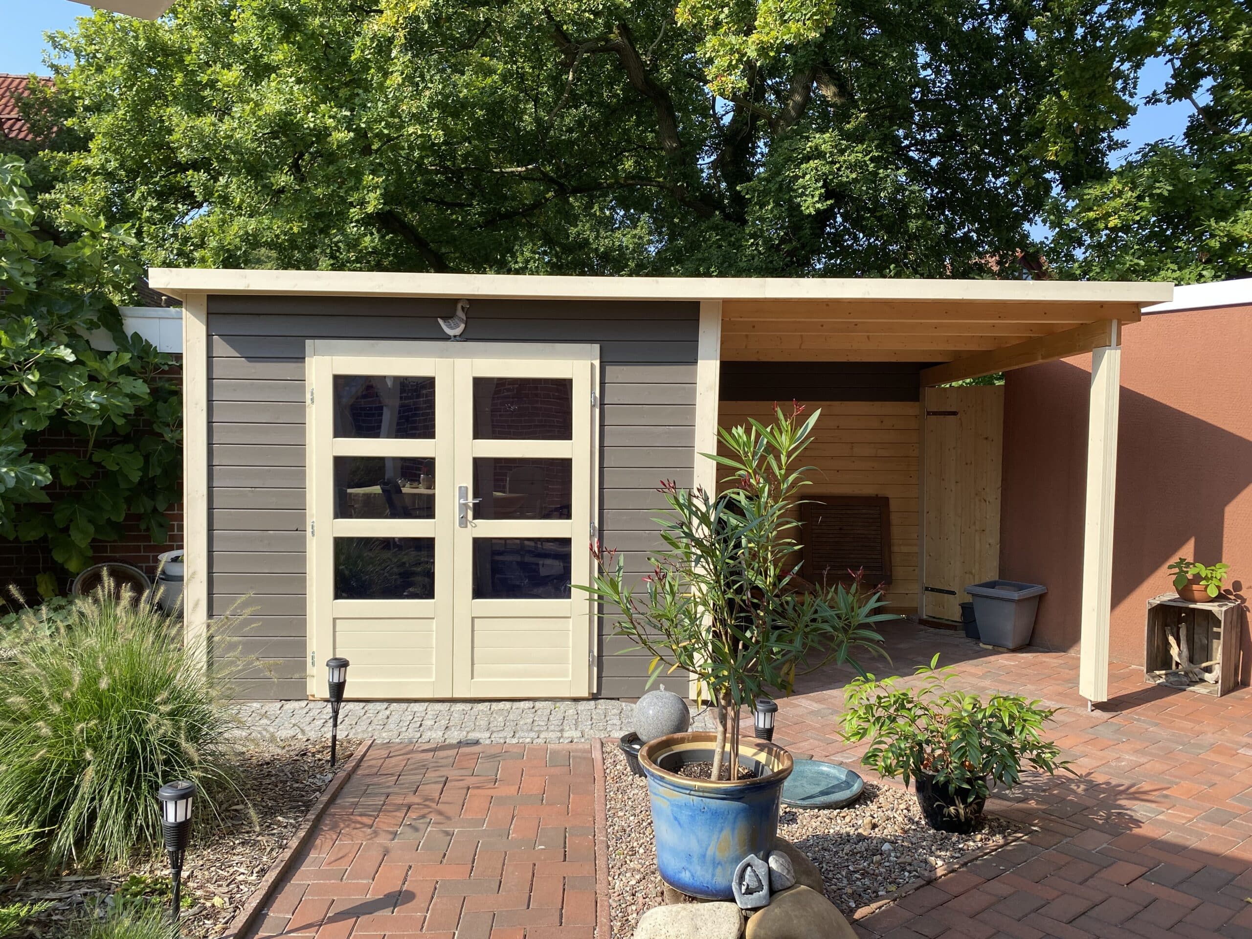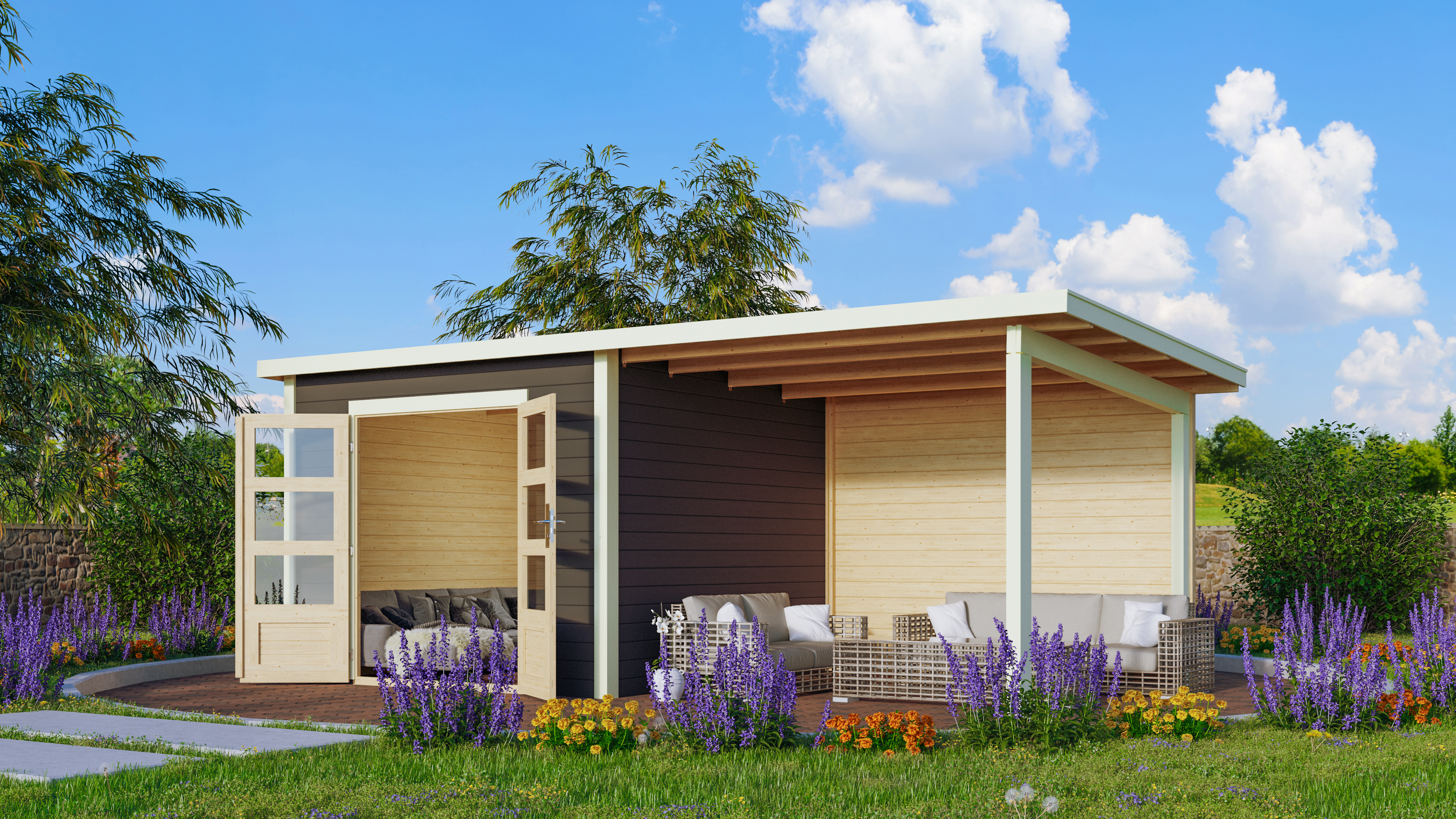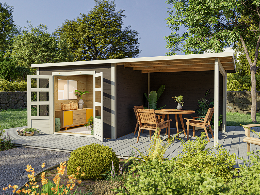 Gartenhaus Wacken 6 28 mm terragrau, inkl. 3 m Anbau + Rückwand