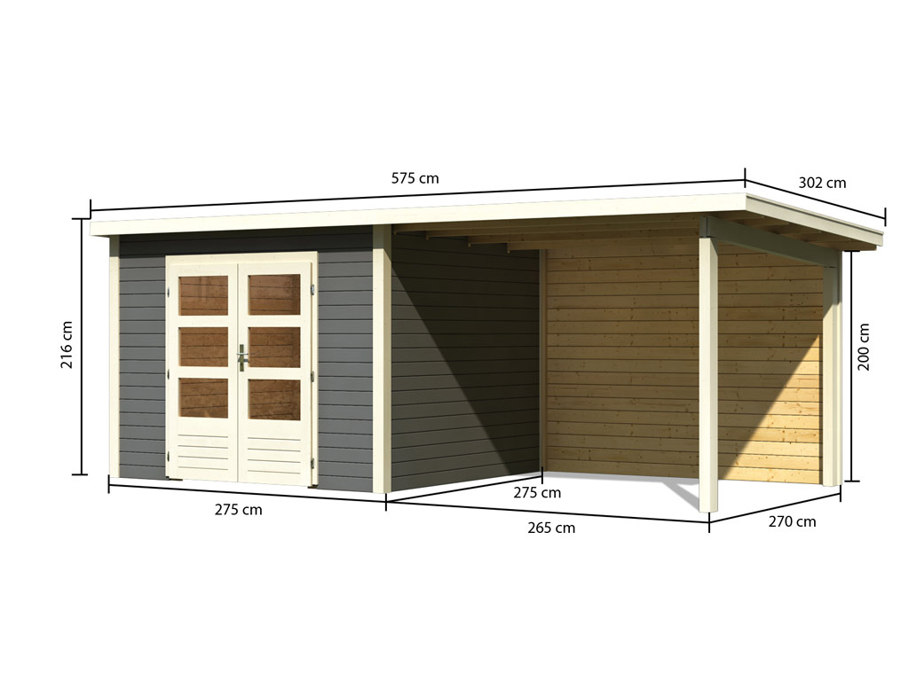 B x T x H: 575 x 302 x 216 cm, Sockelmaß Haus: B x T: 270 x 270 cm, inkl. 298 cm Anbaudach mit Rückwand