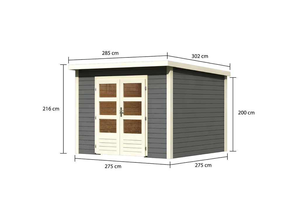 B x T x H: 285 x 302 x 216 cm, Sockelmaß Haus: B x T: 270 x 270 cm, inkl. Doppelflügeltür mit Lichtausschnitten