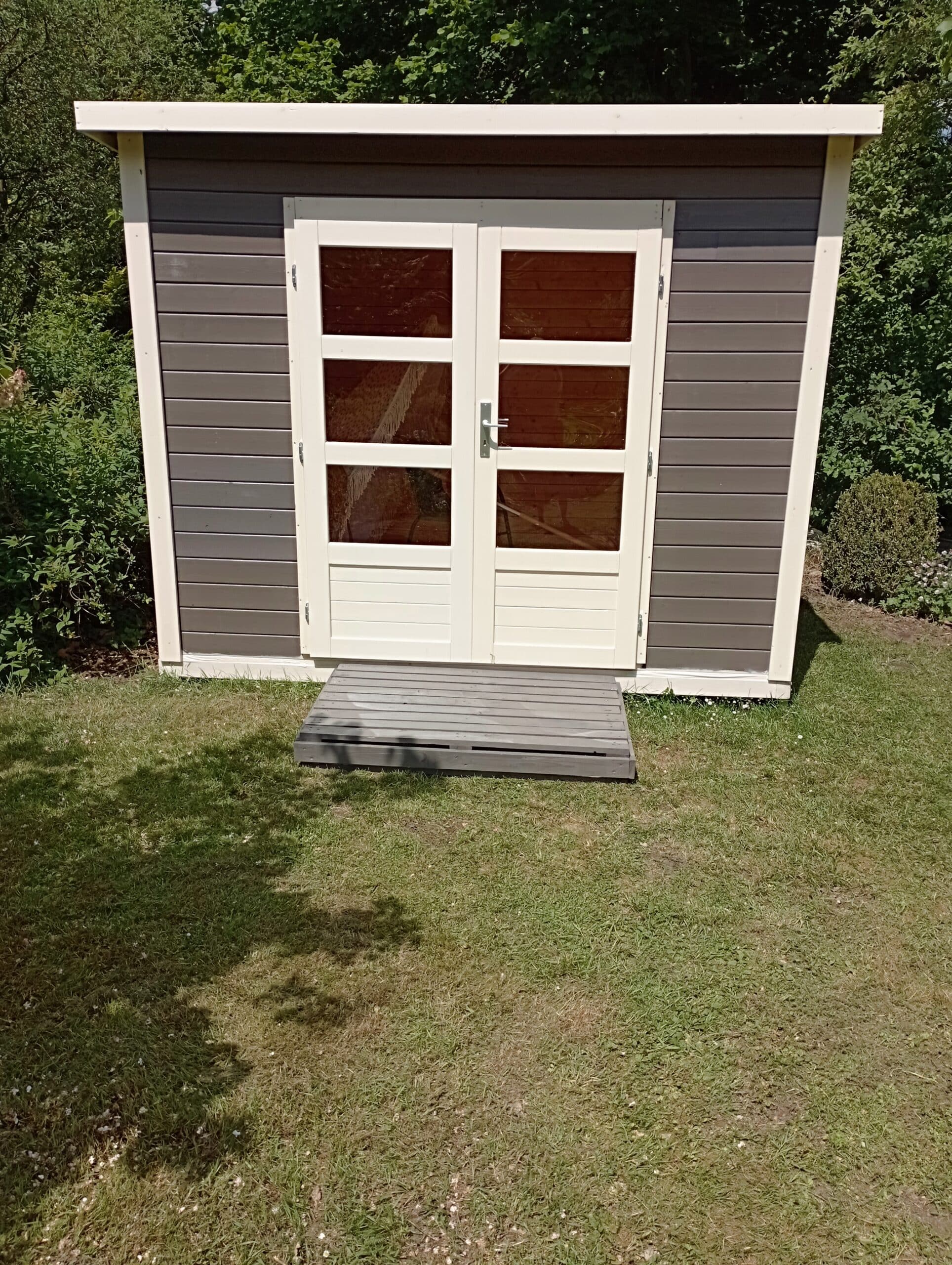 Um die Langlebigkeit des Holzes zu erhöhen und das Gartenhaus optisch aufzuwerten, wurde die Oberfläche des Gartenhauses mit Lack behandelt. Der Holzlack bietet Schutz, indem er die Außenwände des Gartenhauses versiegelt. Somit ist es von Anfang an gegen Witterungseinflüsse und Schädlinge geschützt.