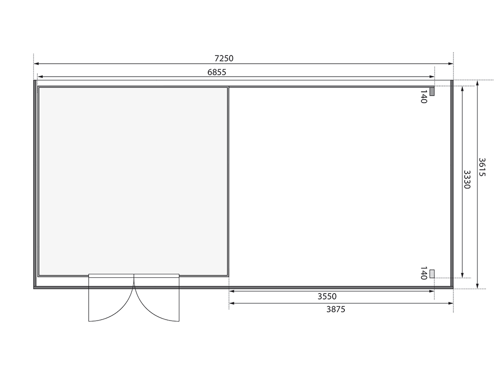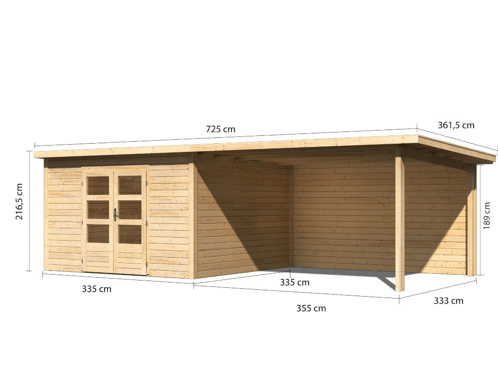 B x T x H: 725 x 361,5 x 216,5 cm, Sockelmaß Haus: B x T: 330,6 x 330,6 cm, inkl. 4 m Anbaudach