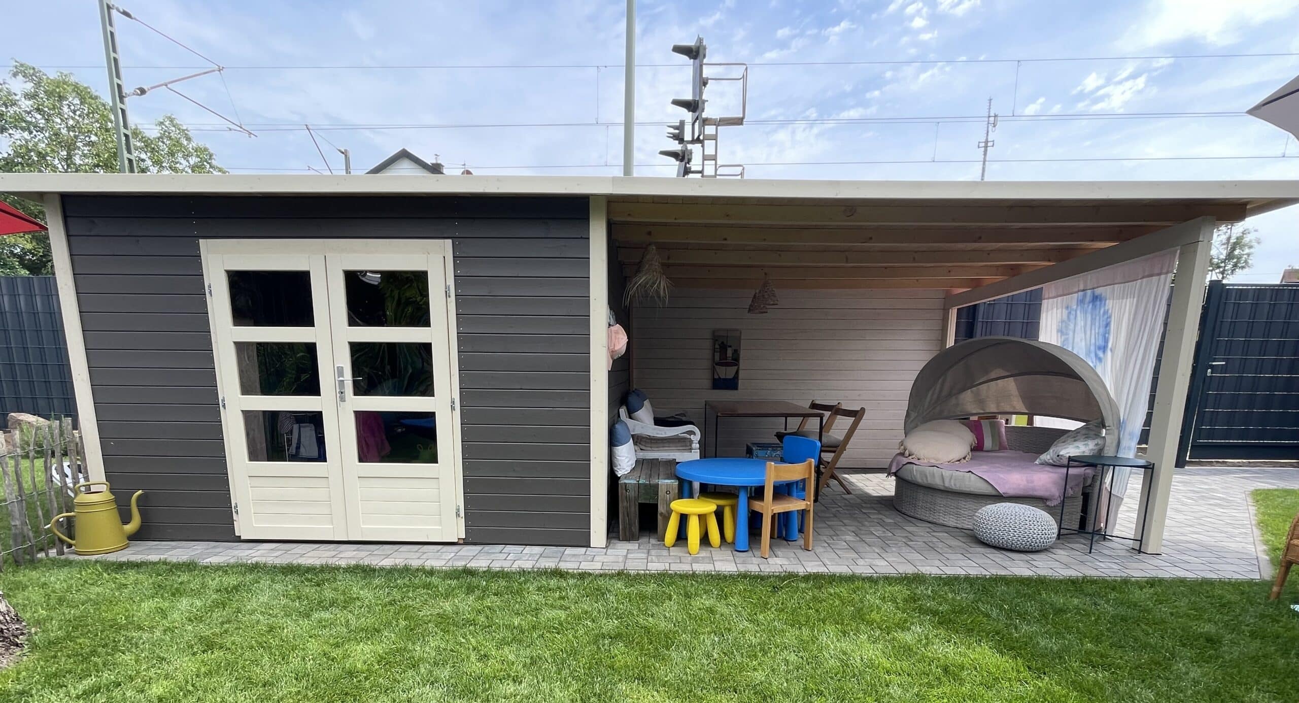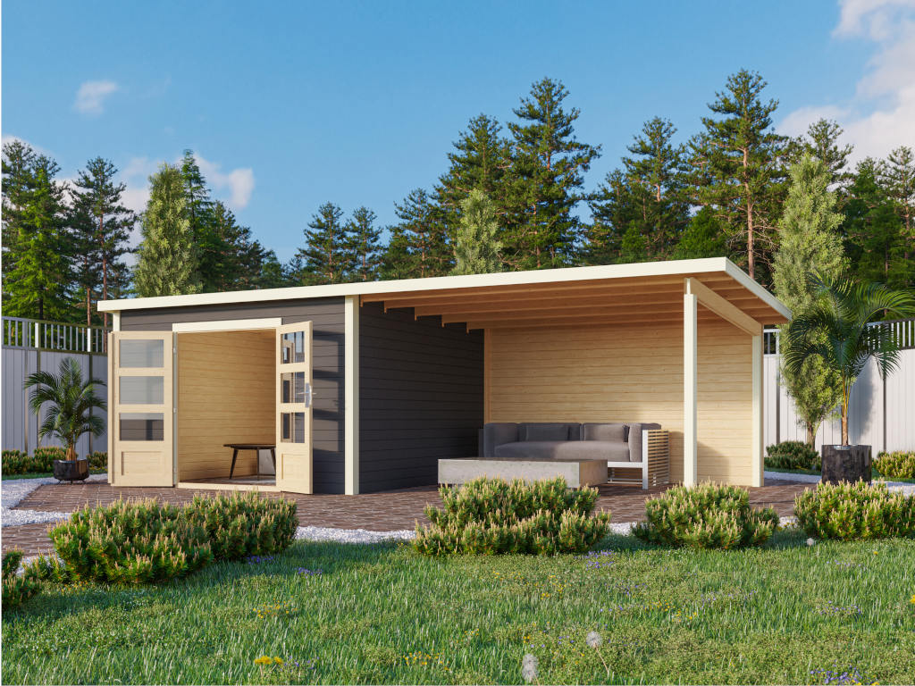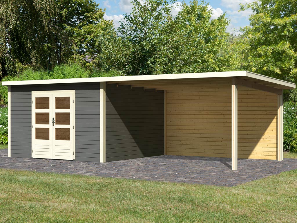 Gartenhaus Wacken 8 28 mm terragrau inkl. 4 m Anbau + Rückwand