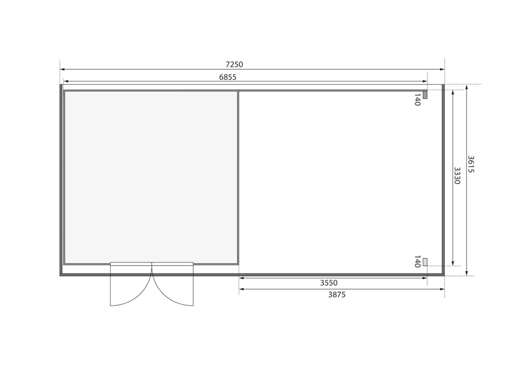 Die Grundfläche dieses Gartenhauses beträgt 26,28 m² mit einem Sockelmaß (Haus ohne Anbau) von 330,6 x 330,6 cm (B x T). Eine optimale Raumnutzung wird dank einer Firsthöhe von 216,5 cm gewährt.