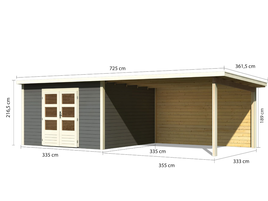 B x T x H: 725 x 361,5 x 216,5 cm, Sockelmaß Haus: B x T: 330,6 x 330,6 cm, inkl. 4 m Anbaudach