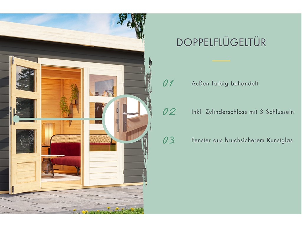 B x T x H: 424 x 274 x 230 cm, Sockelmaß Haus: B x T: 420 x 270 cm, inkl. Doppelflügeltür + Einflügeltür + 2 Räume