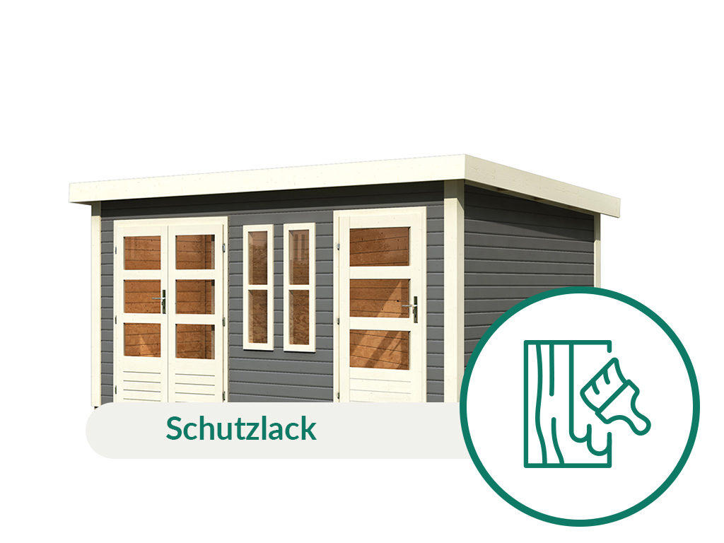 Um die Langlebigkeit des Holzes zu erhöhen und das Gartenhaus optisch aufzuwerten, wurde die Oberfläche mit Lack behandelt. Der Holzlack bietet Schutz, indem er die Außenwände des Gartenhauses versiegelt. Somit ist es von Anfang an gegen Witterungseinflüsse und Schädlinge geschützt.