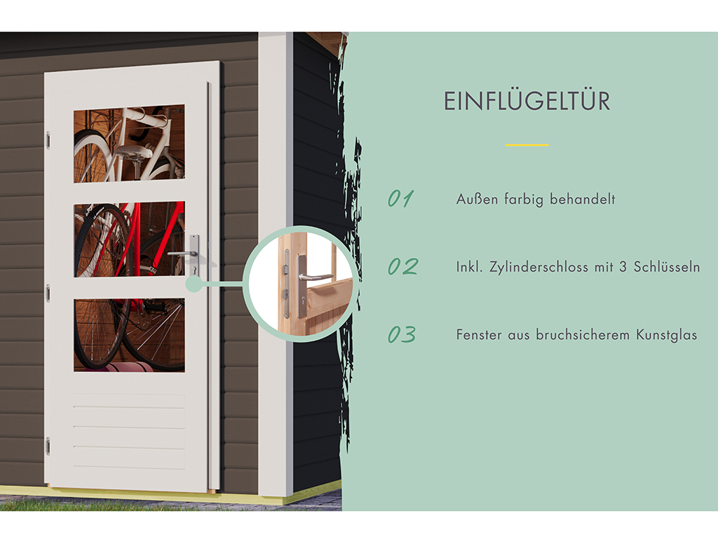 Das Gartenhaus wird ohne Fußboden geliefert. Einen passenden Fußboden (achte auf die Serienbezeichnung) findest du in unserem Zubehörsortiment.