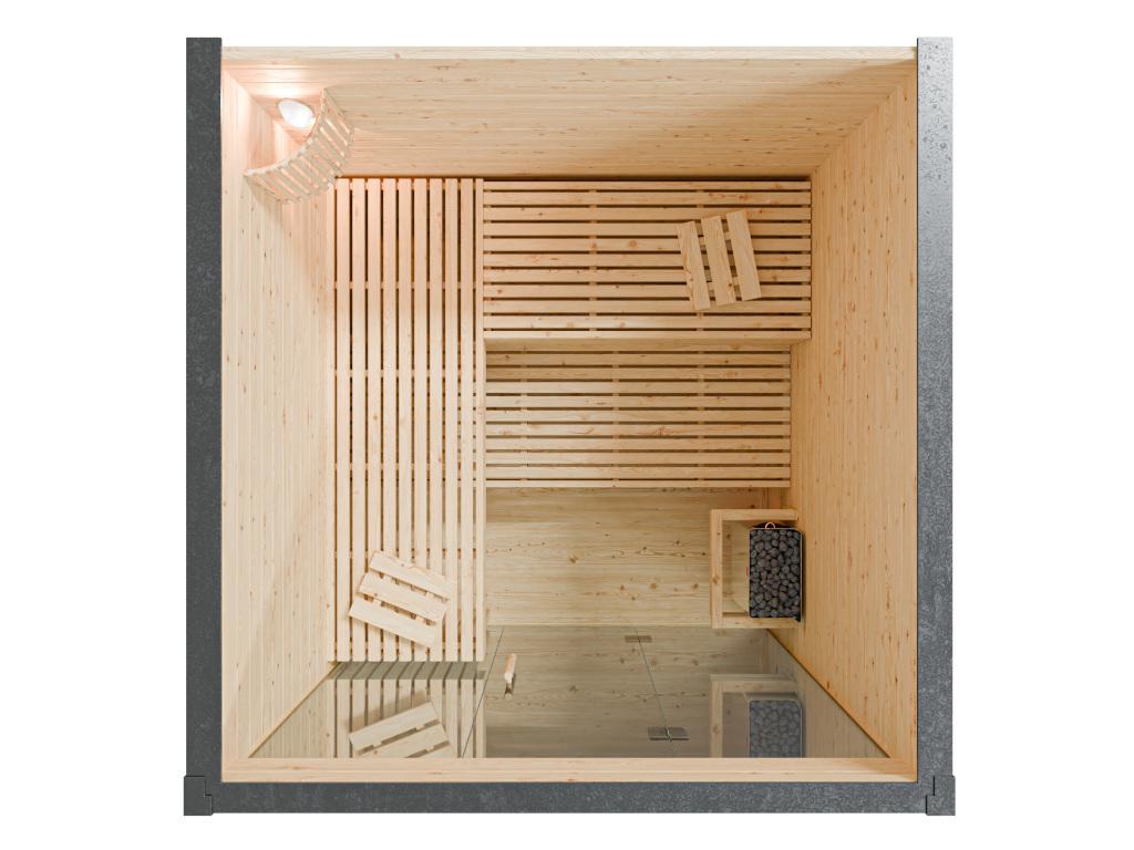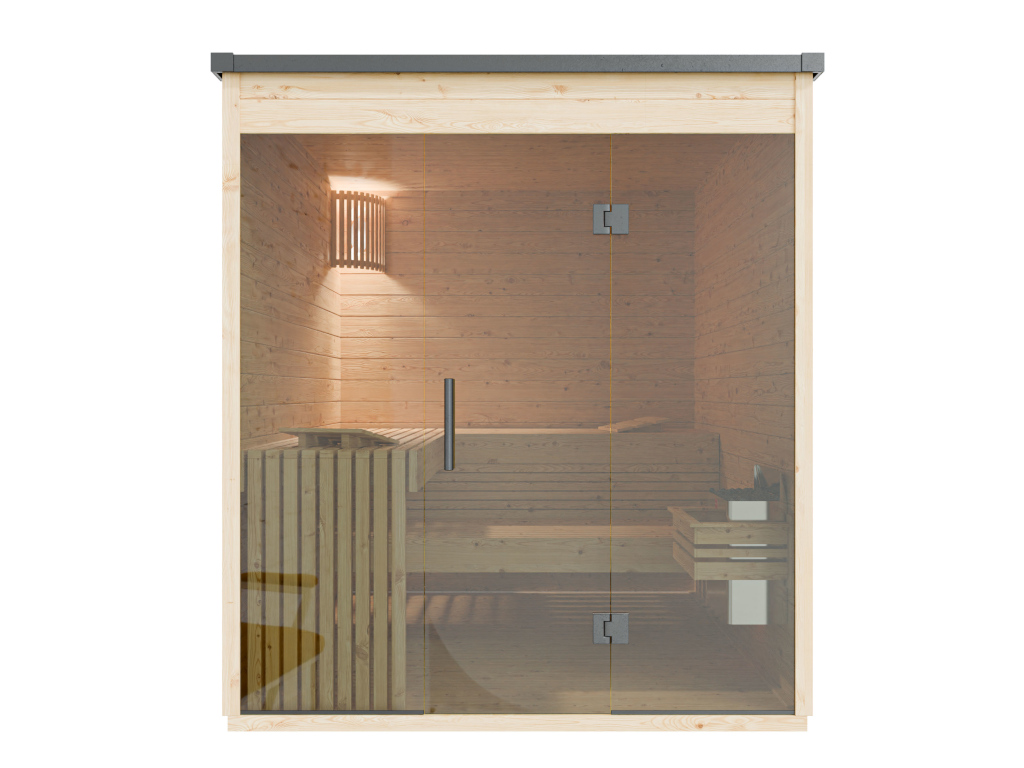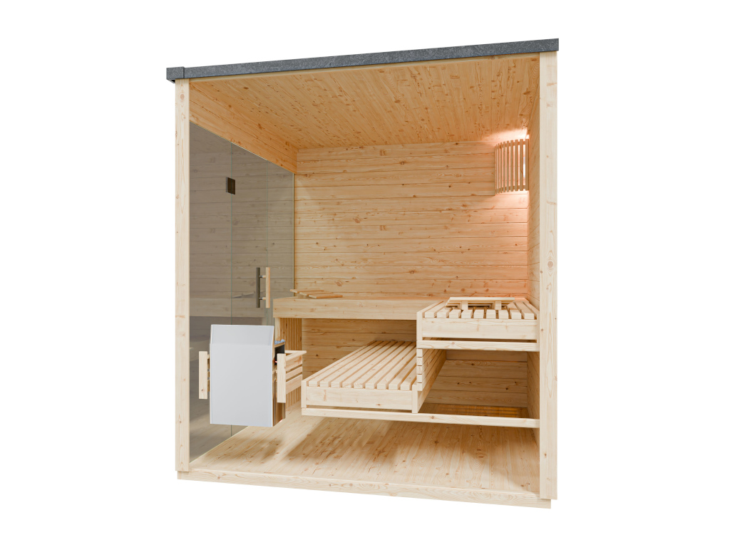 B x T x H: 196 x 196 x 221 cm, Glasfront, inkl. 9kW Ofen mit integrierter Steuerung und Diabassteine