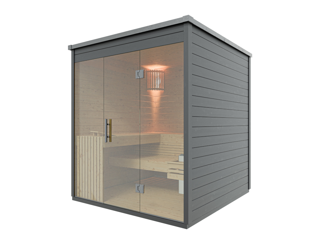 Die Sauna verfügt über eine Graphit-Ganzglastür.