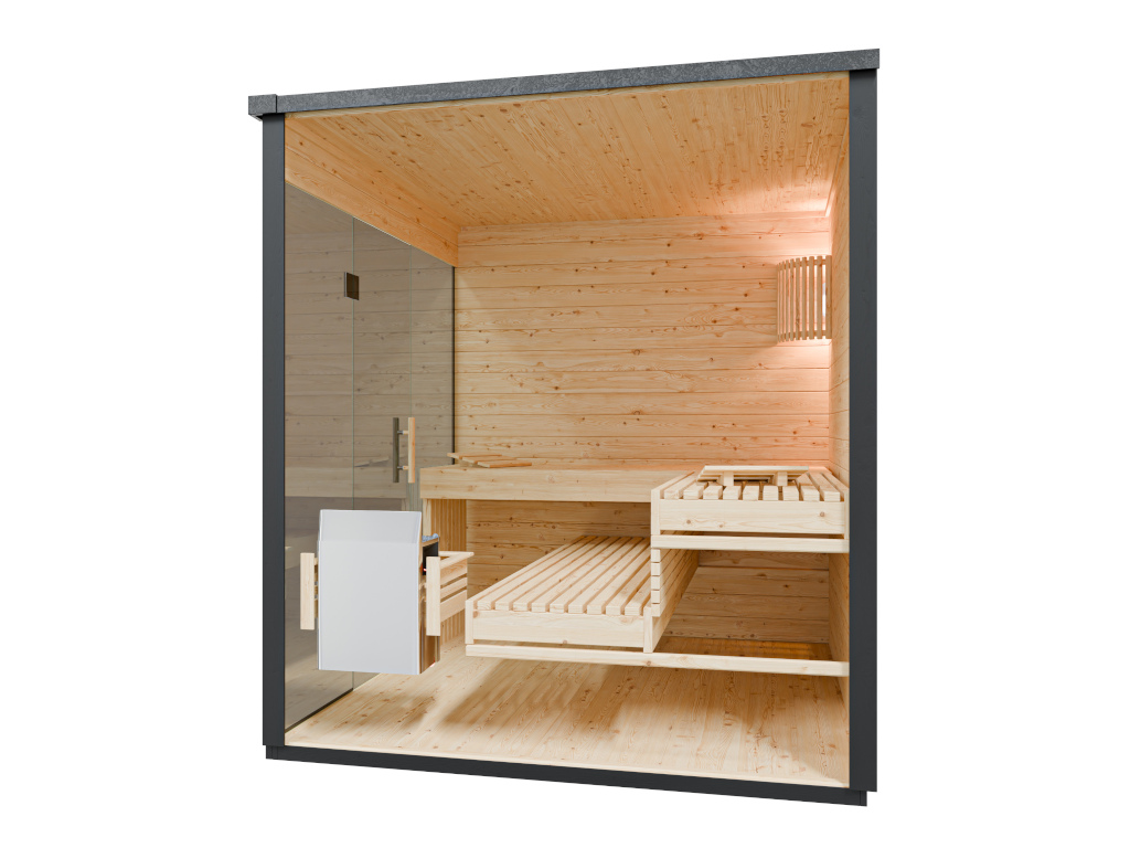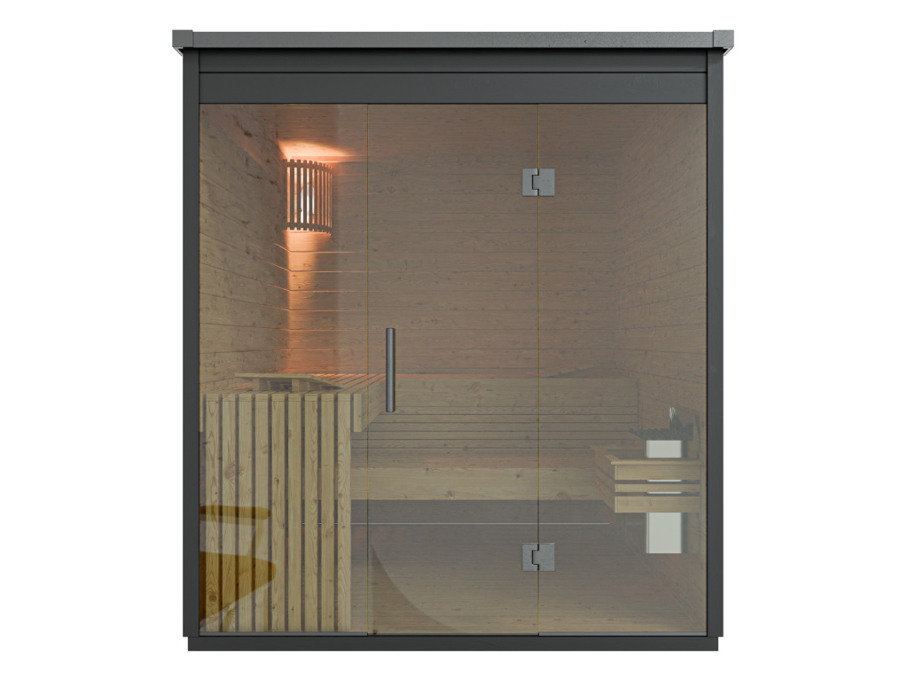 Die Sauna verfügt über eine Graphit-Ganzglastür.
