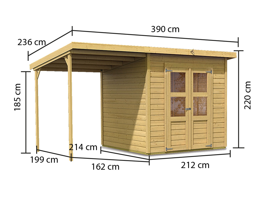 B x T x H: 390 x 236 x 220 cm, Sockelmaß: B x T: 208 x 210 cm, inkl. 140 cm Anbaudach