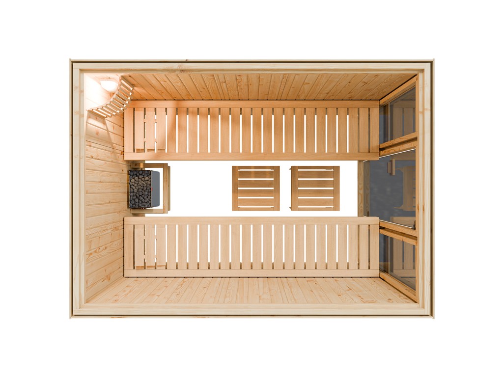 Lieferumfang: | 2 Liegen, 2 Kopfstützen, 2 Hocker, Ofenschutz, Saunaleuchte, Bodenrost und inkl. 2 Front |
