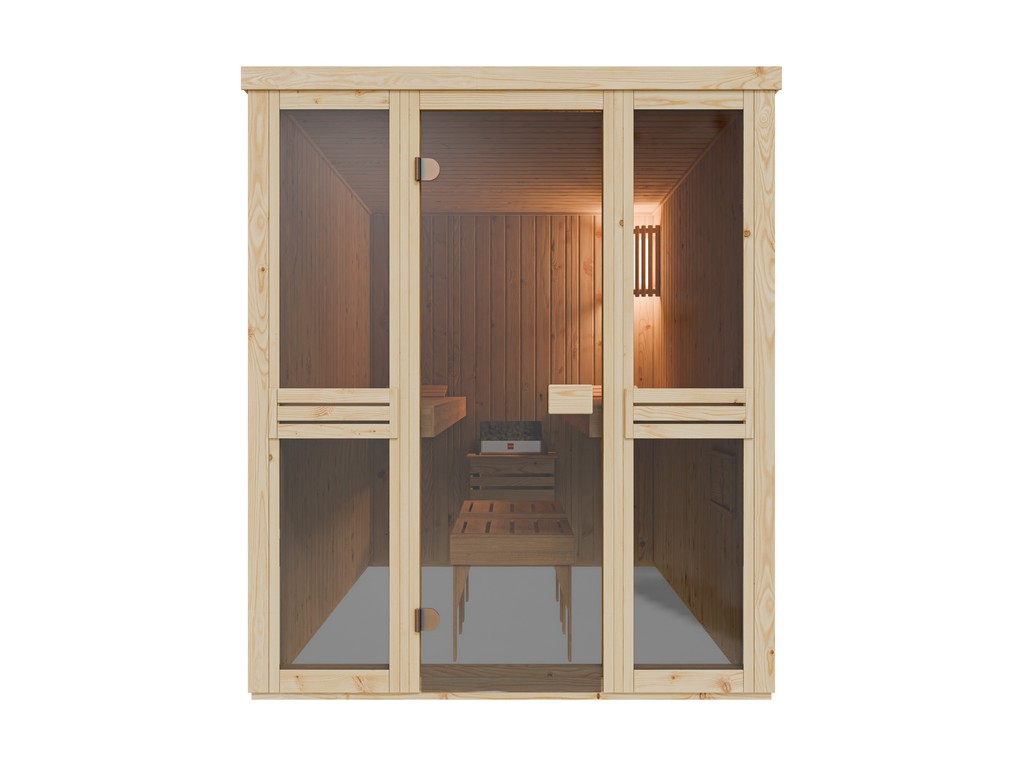 Lieferumfang: | 2 Liegen, 2 Kopfstützen, 2 Hocker, Ofenschutz, Saunaleuchte, Bodenrost und inkl. 2 Front |