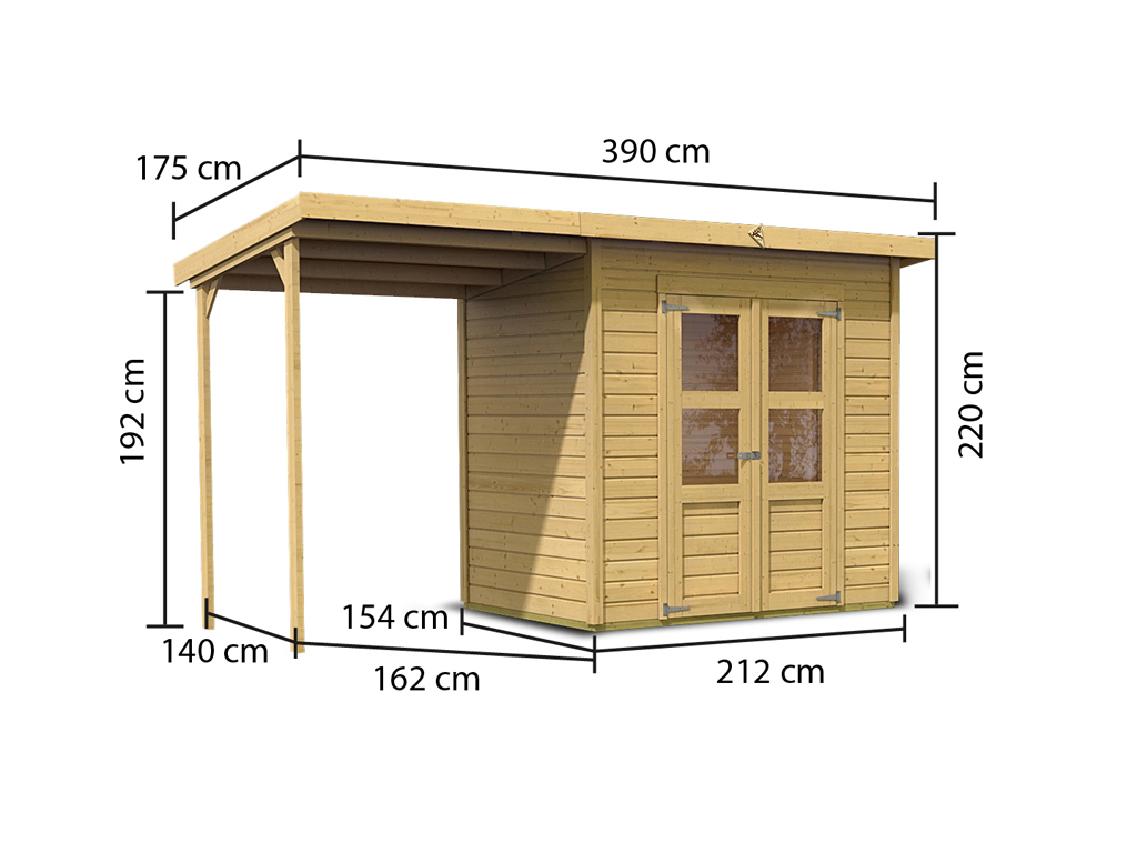 B x T x H: 390 x 175 x 220 cm, Sockelmaß: B x T: 208 x 150 cm, inkl. Anbaudach