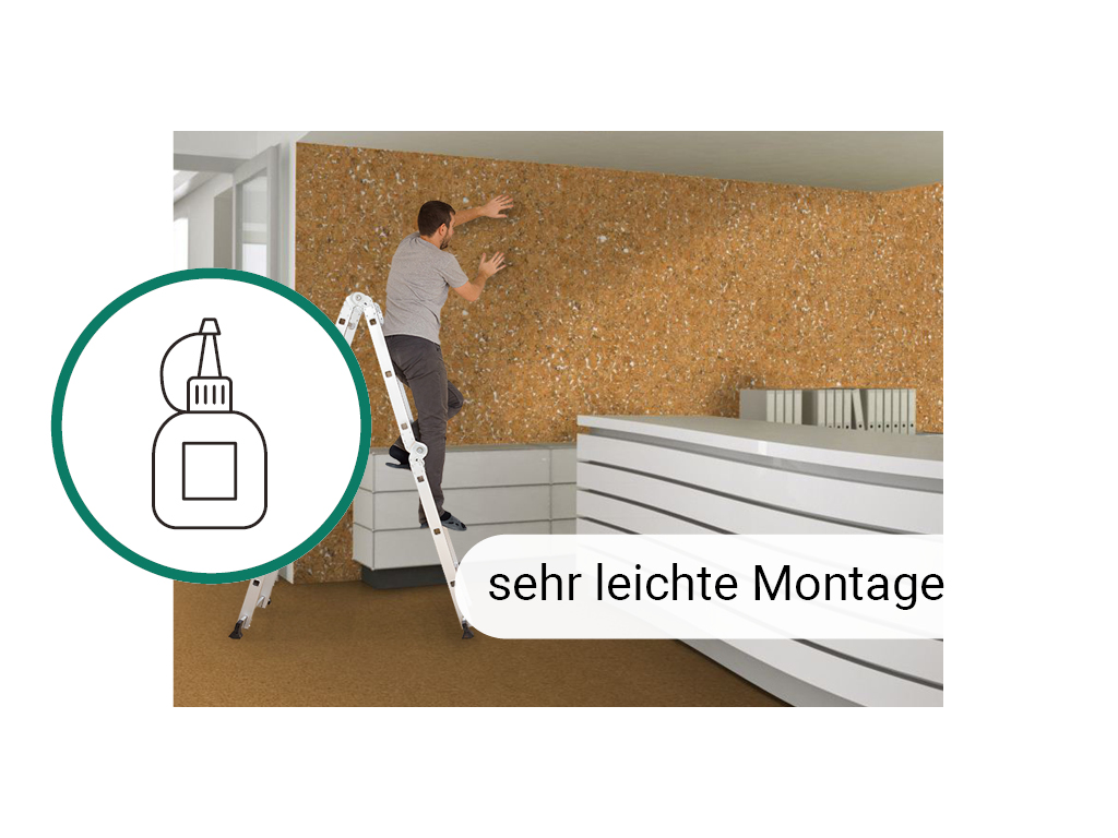 Die Montage ist unkompliziert und lässt sich in wenigen Handgriffen selbst erledigen. Dazu wird der Kontaktkleber auf der Fliese angebracht und diese in die gewünschte Richtung ausgerichtet. Zum Schluss wird die Korkfliese nur noch an die Wand gedrückt und nochmals feinjustiert.