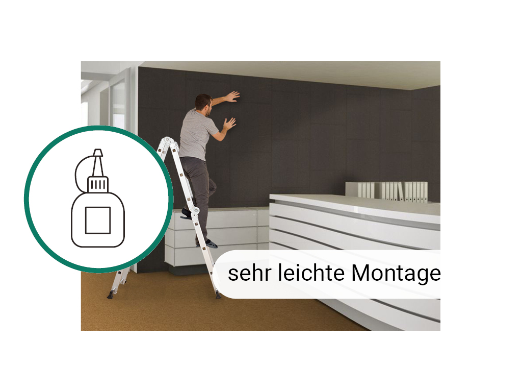 Die Montage ist unkompliziert und lässt sich in wenigen Handgriffen selbst erledigen. Dazu wird der Kontaktkleber auf der Fliese angebracht und diese in die gewünschte Richtung ausgerichtet. Zum Schluss wird die Korkfliese nur noch an die Wand gedrückt und nochmals feinjustiert.