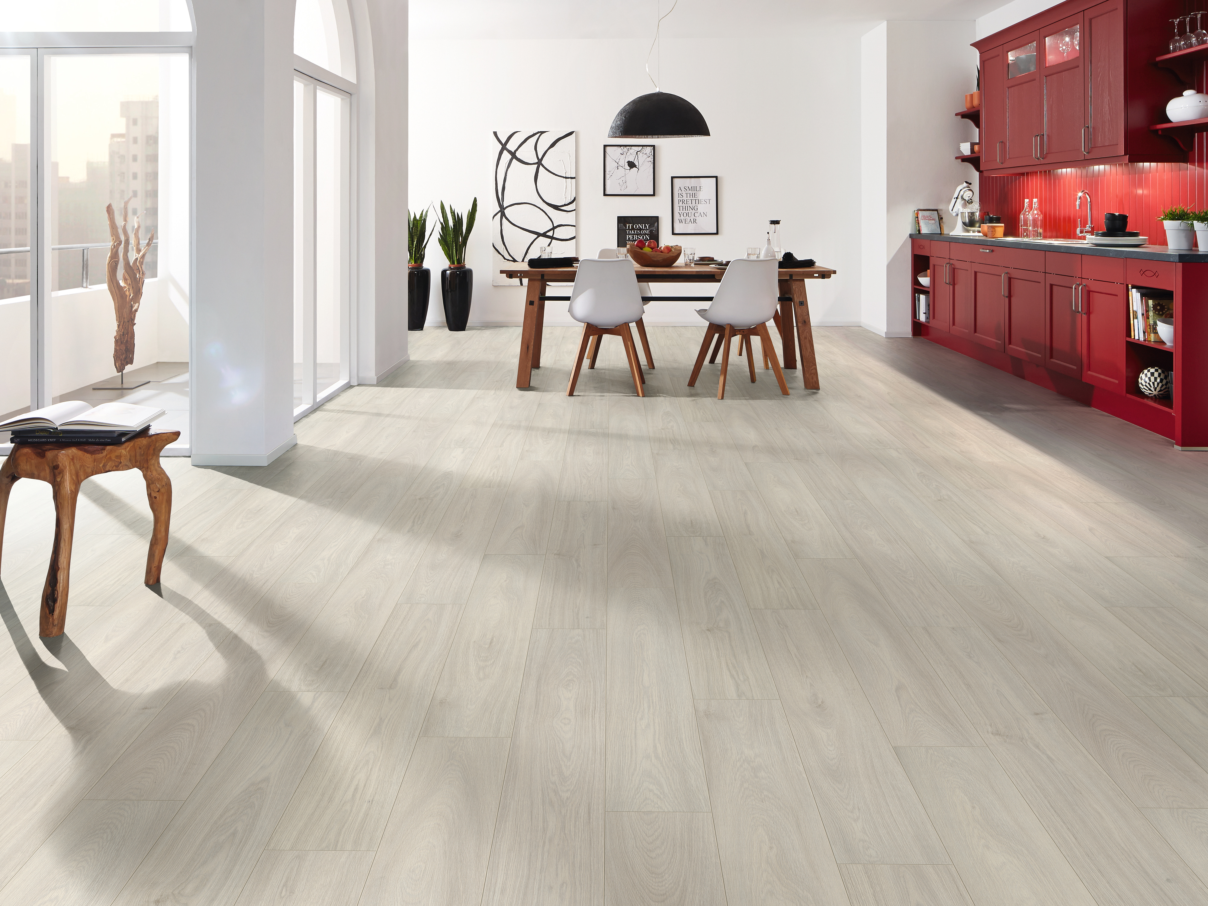 Laminat ist die ideale Kombination aus Design und Funktionalität. Die moderne Optik und die besonders pflegeleichte Oberfläche dieses Laminatbodens machen ihn zum perfekten Bodenbelag für fast jeden Bereich.