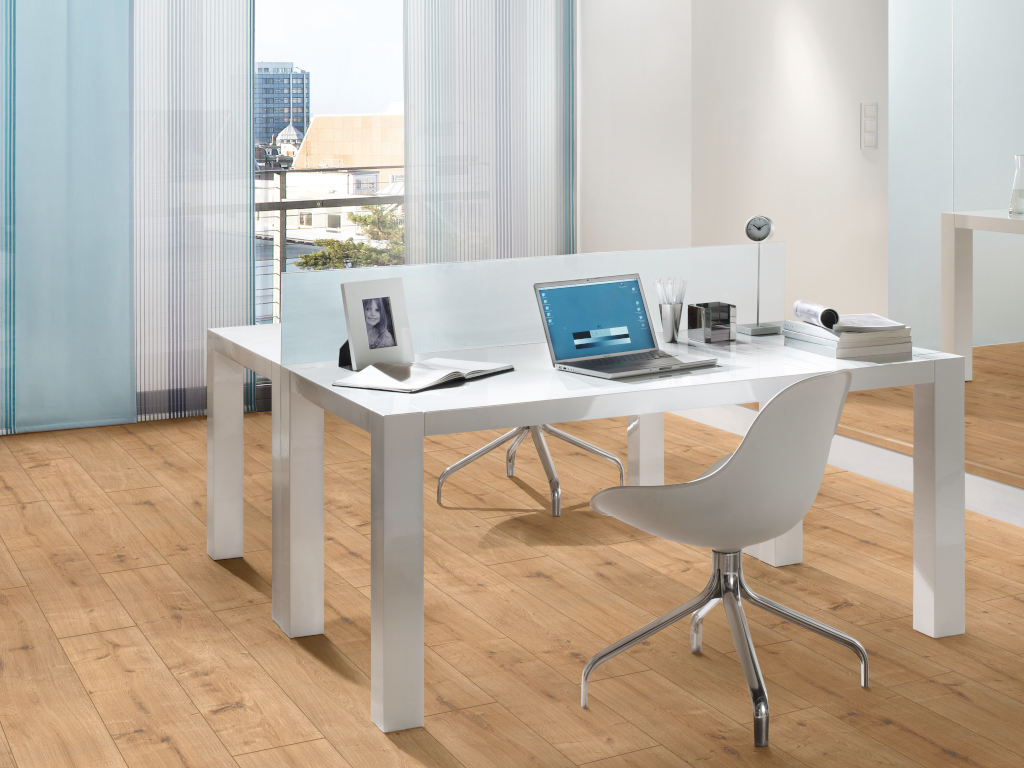 Die Klickverbindung garantiert eine schnelle und leicht zu handhabende schwimmende Verlegung. Der Bodenbelag entspricht der Nutzungsklasse 23 und ist damit für stark frequentierte Flächen im privaten Bereich geeignet, z. B. für Treppenflure oder Eingangsbereiche. Mit der gewerblichen Nutzungsklasse (NK) 31 eignet er sich für leichte Beanspruchung wie in Kleinbüros oder Konferenzräumen.