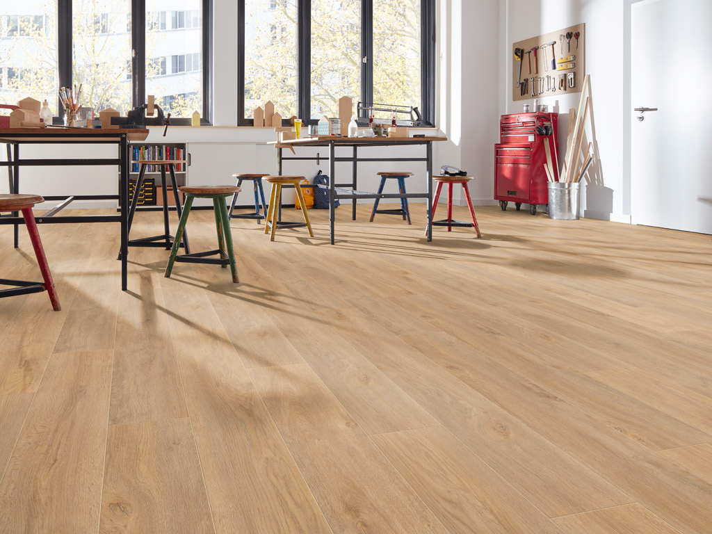 Mithilfe der Klickverbindung kann der Boden problemlos schwimmend verlegt werden. Der Bodenbelag entspricht der Nutzungsklasse 23 und ist damit für stark frequentierte Flächen im privaten Bereich geeignet, z. B. für Treppenflure oder Eingangsbereiche. In Wartezimmern, Büros oder Boutiquen mit kontinuierlicher Nutzung kann er mit der Nutzungsklasse (NK) 32 im gewerblichen Bereich punkten.