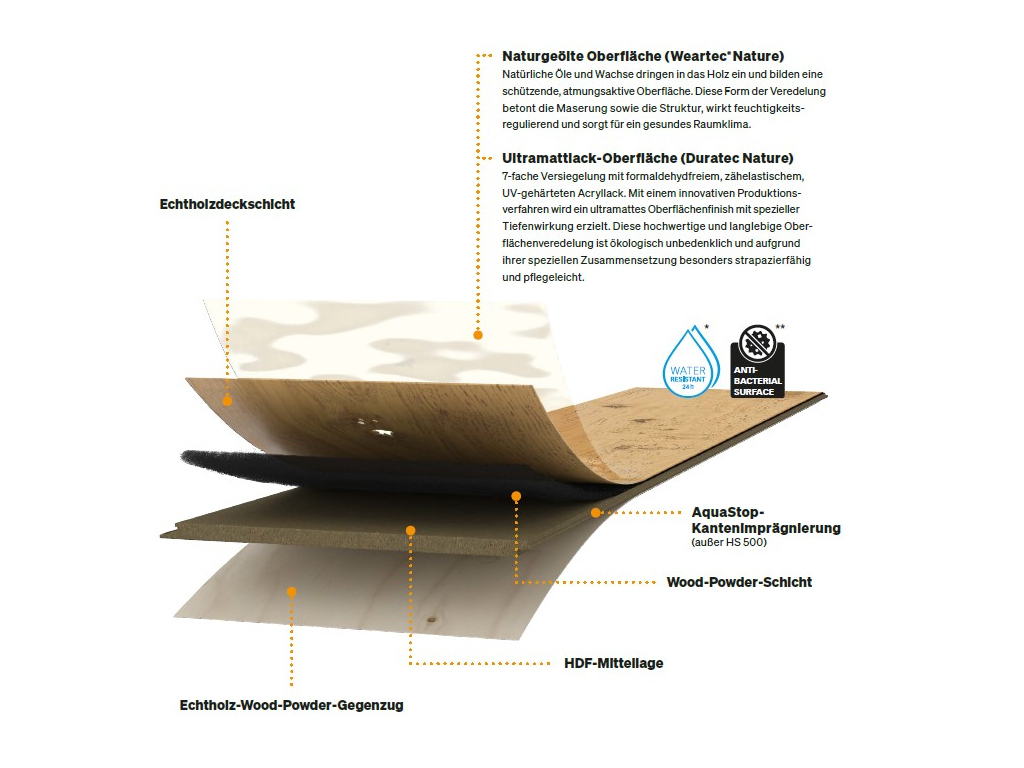 Die Kollektion HD 400 steht für moderne und qualitativ hochwertige Parkettböden. Mit einem einfachen und schnellen Verlegesystem gestaltet sich die Installation mühelos. Die Serie überzeugt durch ein bis zu dreifach verbessertes Eindruckverhalten im Vergleich zu herkömmlichem Parkett, was für eine verlängerte Lebensdauer sorgt. Durch die Verschmelzung von Echtholzdeckschichten und Wood-Powder entsteht eine einzigartige strapazierfähige Oberfläche, die dank geschlossener Poren weniger Schmutz aufnimmt und besonders leicht zu reinigen ist. HD 400 ist mit dem Blauen Engel und PEFC-zertifiziert sowie QNG-ready. Darüber hinaus ist der Boden 24 Stunden wasserresistent und somit auch für Feuchträume geeignet.