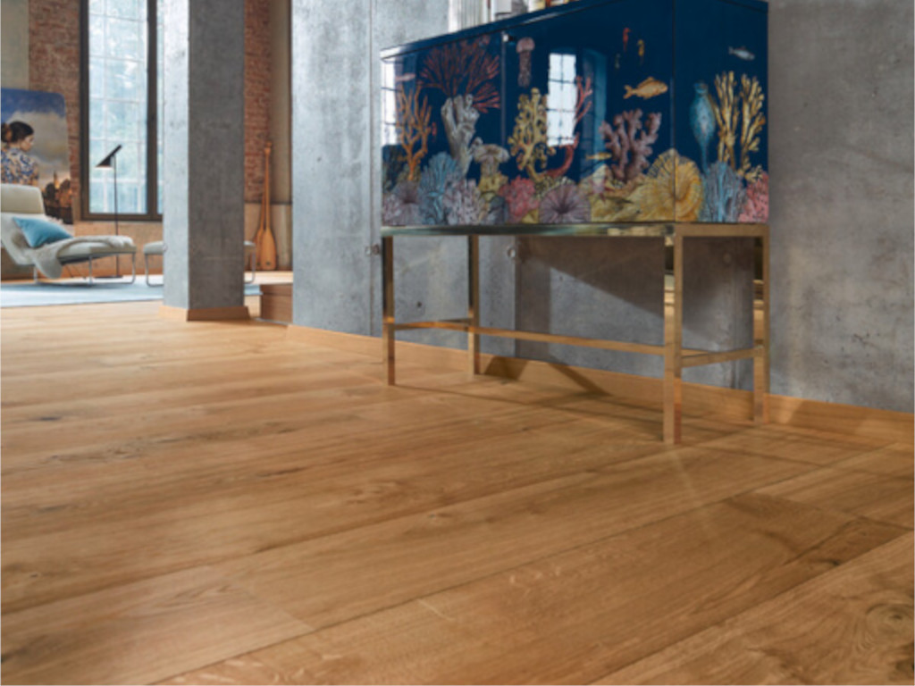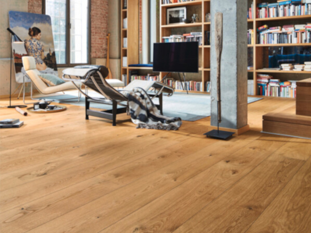 Mit 27 cm sind die Dielen dieses Parkettbodens außergewöhnlich breit. Das verschafft ihnen eine besonders solide und stabile Erscheinung.