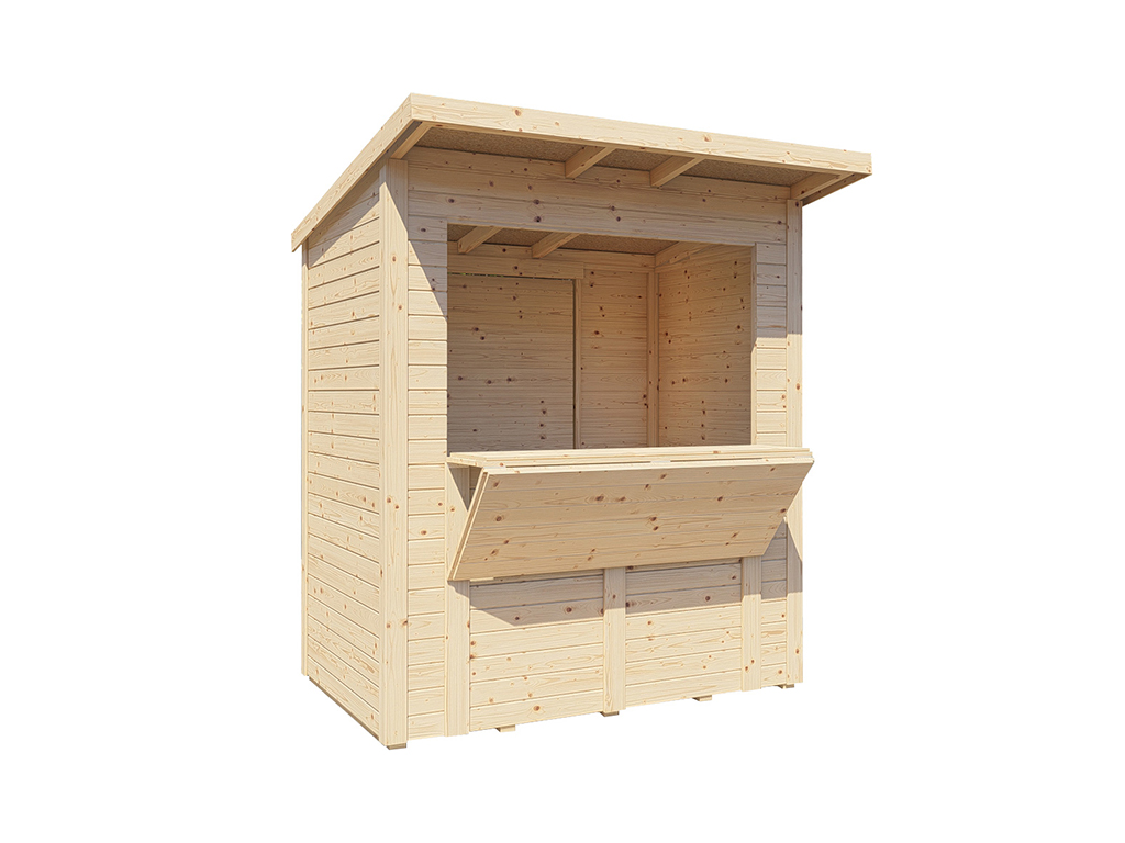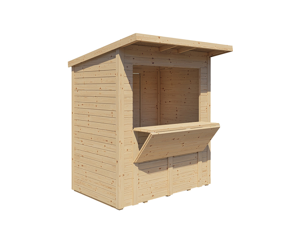 Dank der vorgefertigten, passgenauen 14 mm starken Wandelemente mit stabiler Doppelrahmung kann der Verkaufsstand einfach auf- und abgebaut werden. - Naturbelassen