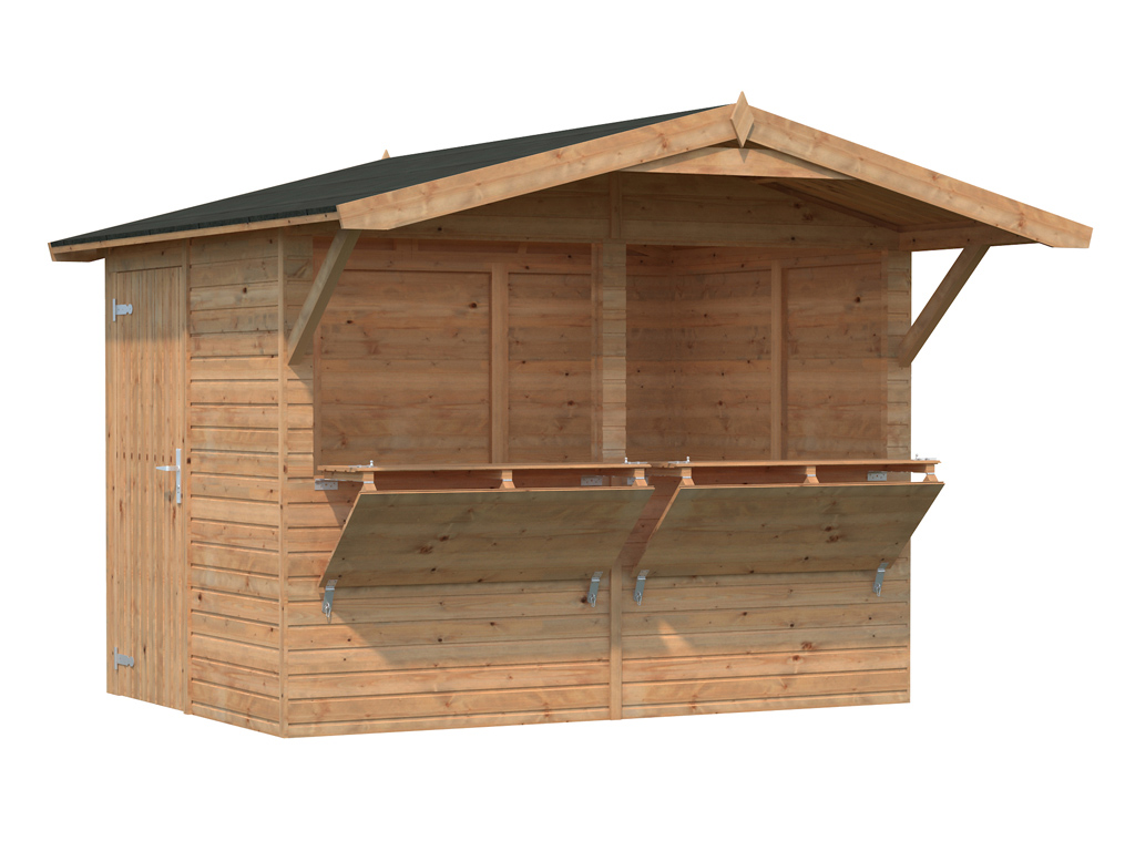 Der 5 m² große Marktstand ist mit einem zweigeteilten Verkaufsfenster mit 34 cm tiefem Tresen ausgestattet, das sich von innen mit einem Riegel verschließen lässt. - Inkl. abschließbarer Seitentür