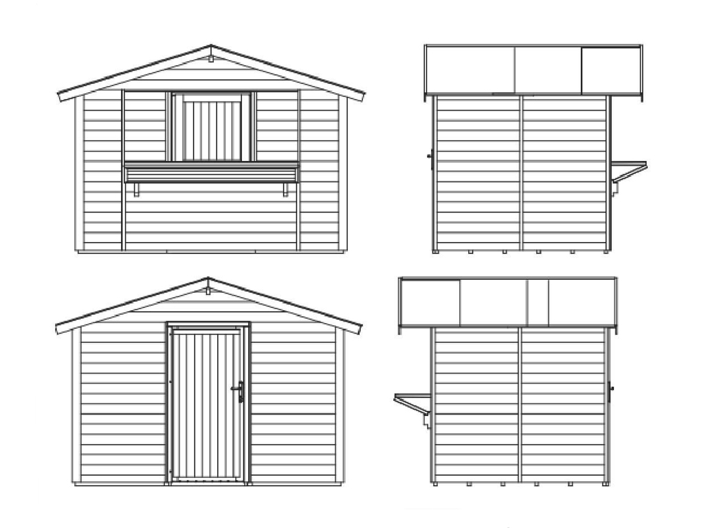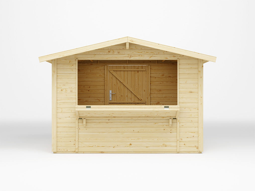 Der 6 m² große Marktstand mit einem Wandaußenmaß ohne Dachüberstände von 300 x 200 cm ist mit einem großen Verkaufsfenster (ca. B 199 x H 88 cm) ausgestattet, das sich von innen mit einem Riegel verschließen lässt. - Inkl. abschließbarer Tür in Rückwand