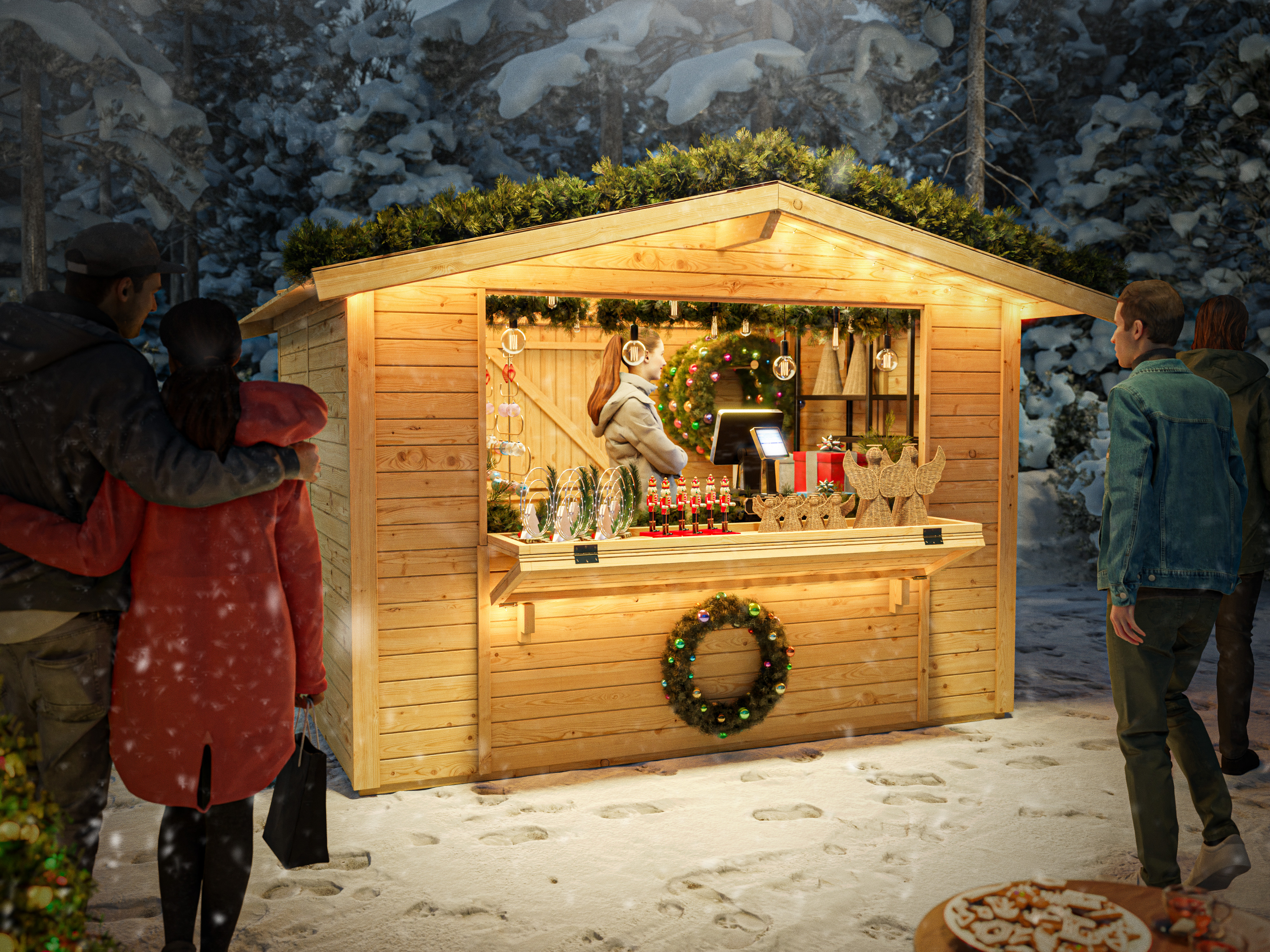 Der Marktstand aus nordischem Fichtenholz bietet bei geöffnetem Verkaufsfenster ein praktisches Vordach, dass Deine Waren und auch deine Kundschaft vor Regen und Schnee schützt. - Einfacher Aufbau