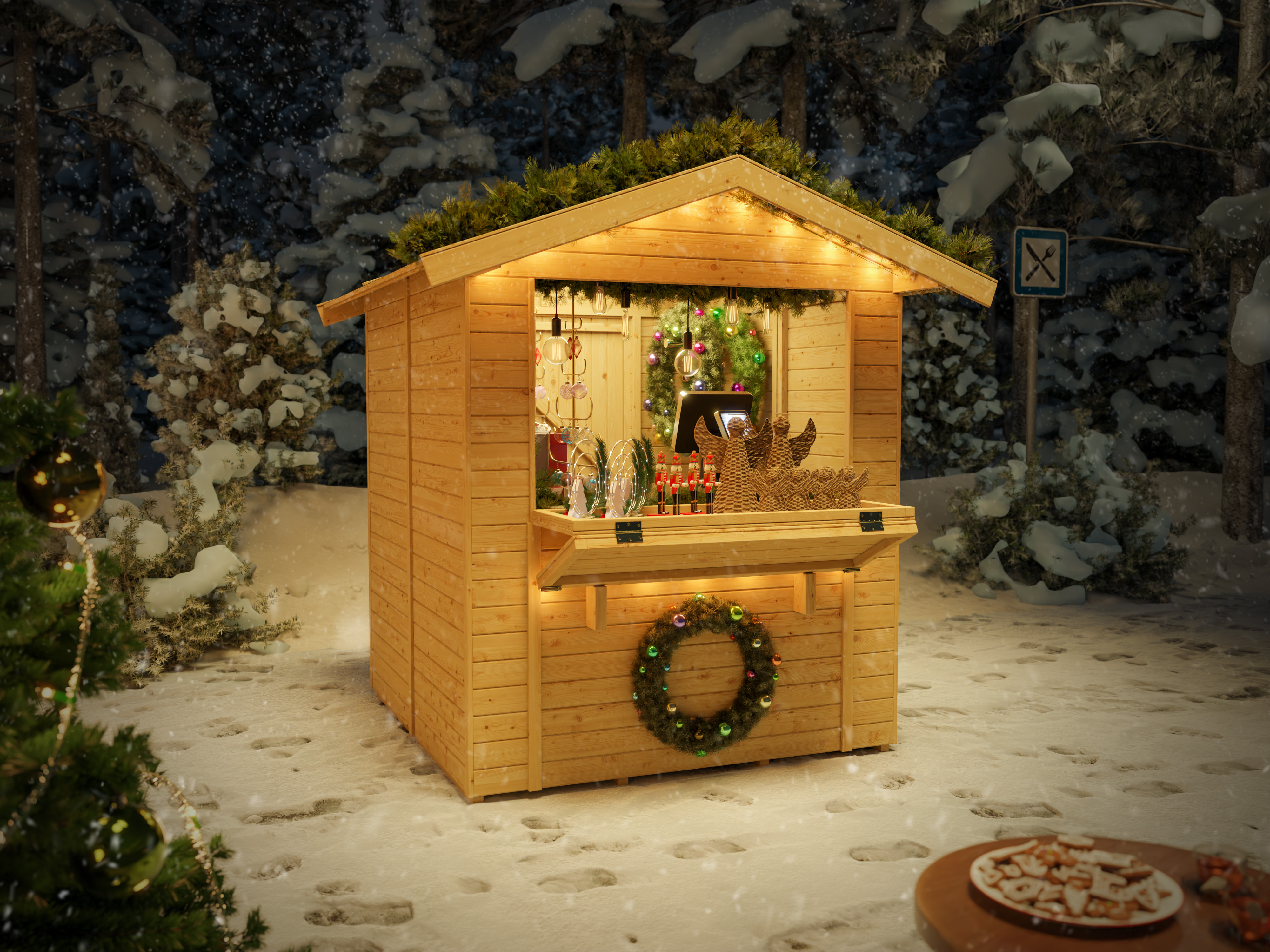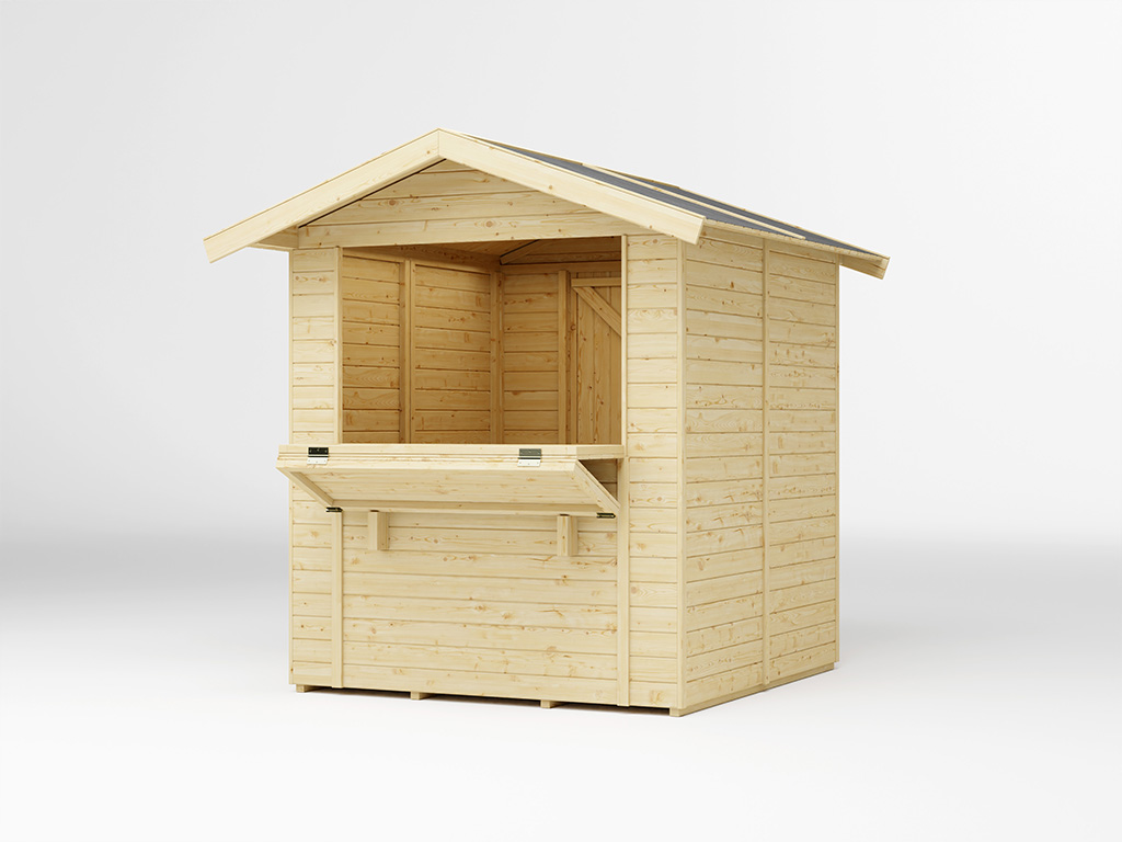 Der Marktstand aus nordischem Fichtenholz bietet bei geöffnetem Verkaufsfenster ein praktisches Vordach, dass Deine Waren und auch deine Kundschaft vor Regen und Schnee schützt. - Einfacher Aufbau